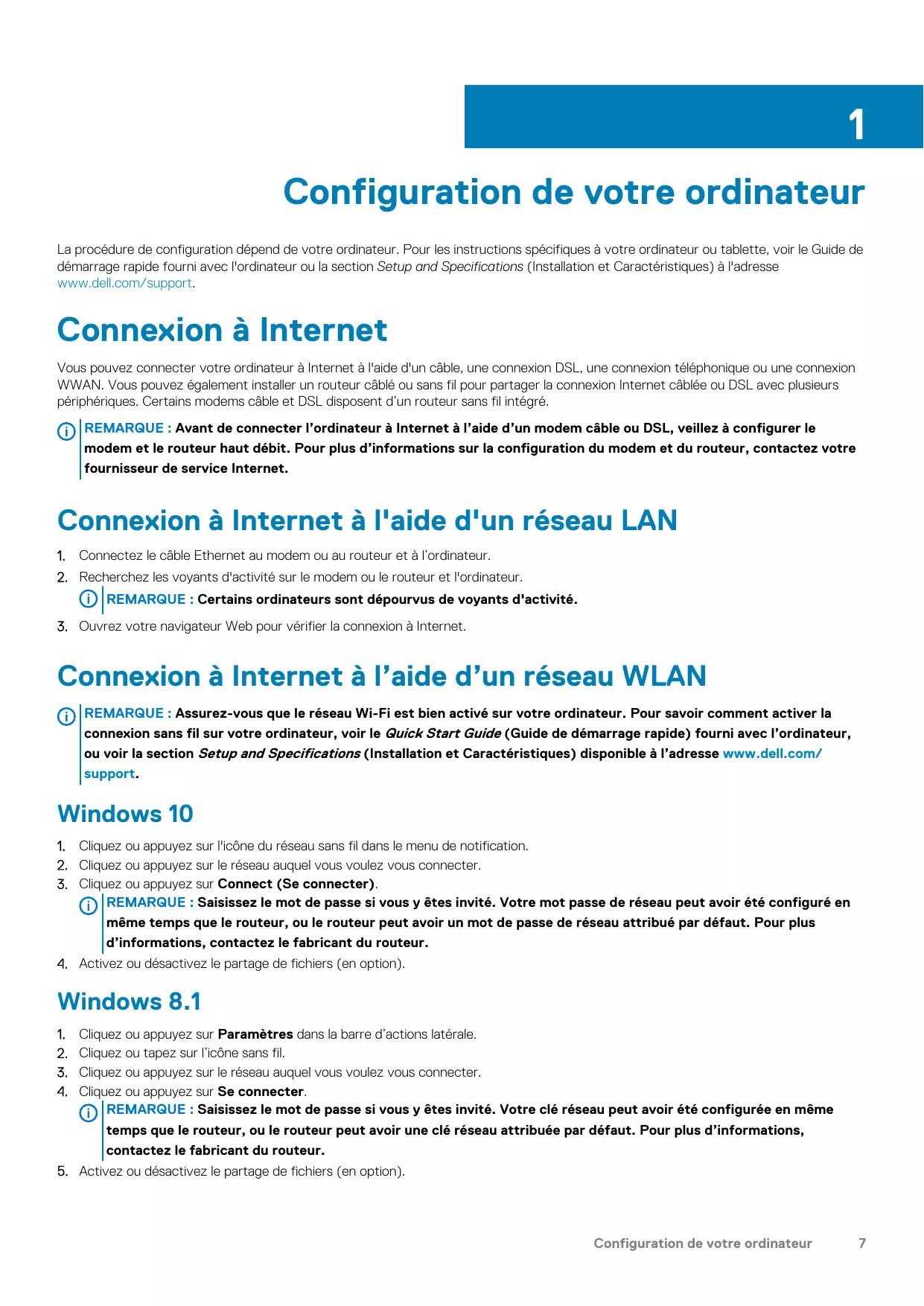 Configuration de votre ordinateur La procédure de configuration dépend de votre ordinateur. Pour les instructions spécifiques à votre ordinateur ou tablette, voir le Guide de démarrage rapide fourni avec l'ordinateur ou la section Setup and Specifications (Installation et Caractéristiques) à l'adresse www.dell.com/support. Connexion à Internet Vous pouvez connecter votre ordinateur à Internet à l'aide d'un câble, une connexion DSL, une connexion téléphonique ou une connexion WWAN. Vous pouvez également installer un routeur câblé ou sans fil pour partager la connexion Internet câblée ou DSL avec plusieurs périphériques. Certains modems câble et DSL disposent d’un routeur sans fil intégré. REMARQUE : Avant de connecter l’ordinateur à Internet à l’aide d’un modem câble ou DSL, veillez à configurer le modem et le routeur haut débit. Pour plus d’informations sur la configuration du modem et du routeur, contactez votre fournisseur de service Internet. Connexion à Internet à l'aide d'un réseau LAN