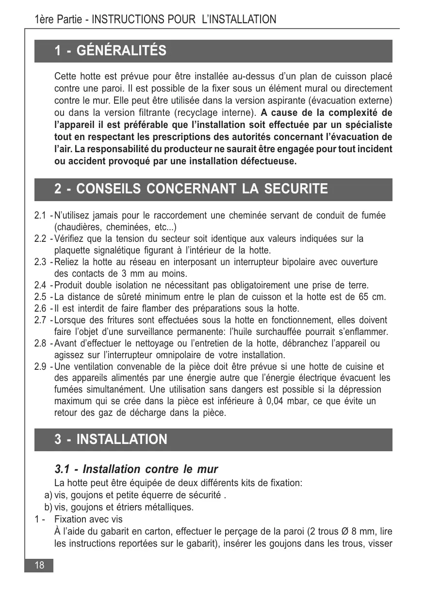 | Caractéristiques techniques principales | Hotte murale, extraction ou recyclage, éclairage LED |