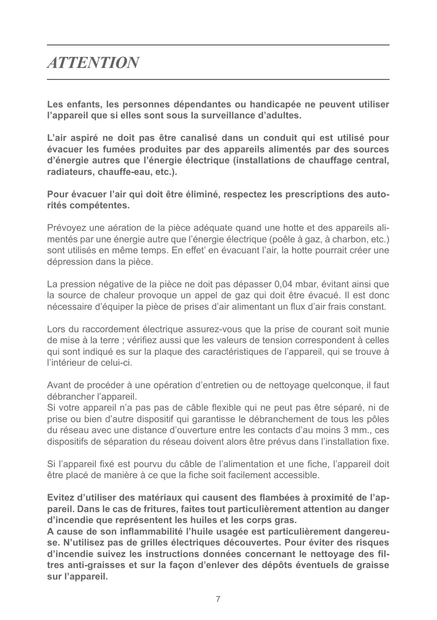 ATTENTION Les enfants, les personnes dépendantes ou handicapée ne peuvent utiliser l’appareil que si elles sont sous la surveillance d’adultes. L’air aspiré ne doit pas être canalisé dans un conduit qui est utilisé pour évacuer les fumées produites par des appareils alimentés par des sources d’énergie autres que l’énergie électrique (installations de chauffage central, radiateurs, chauffe-eau, etc.). Pour évacuer l’air qui doit être éliminé, respectez les prescriptions des autorités compétentes. Prévoyez une aération de la pièce adéquate quand une hotte et des appareils alimentés par une énergie autre que l’énergie électrique (poêle à gaz, à charbon, etc.) sont utilisés en même temps. En effet’ en évacuant l’air, la hotte pourrait créer une dépression dans la pièce. La pression négative de la pièce ne doit pas dépasser 0,04 mbar, évitant ainsi que la source de chaleur provoque un appel de gaz qui doit être évacué. Il est donc nécessaire d’équiper la pièce de prises d’air alimentant un flux d’air frais constant. Lors du raccordement électrique assurez-vous que la prise de courant soit munie de mise à la terre ; vérifiez aussi que les valeurs de tension correspondent à celles qui sont indiqué es sur la plaque des caractéristiques de l’appareil, qui se trouve à l’intérieur de celui-ci. Avant de procéder à une opération d’entretien ou de nettoyage quelconque, il faut débrancher l’appareil. Si votre appareil n’a pas pas de câble flexible qui ne peut pas être séparé, ni de prise ou bien d’autre dispositif qui garantisse le débranchement de tous les pôles du réseau avec une distance d’ouverture entre les contacts d’au moins 3 mm., ces dispositifs de séparation du réseau doivent alors être prévus dans l’installation fixe. Si l’appareil fixé est pourvu du câble de l’alimentation et une fiche, l’appareil doit être placé de manière à ce que la fiche soit facilement accessible. Evitez d’utiliser des matériaux qui causent des flambées à proximité de l’appareil. Dans le cas de fritures, faites tout particulièrement attention au danger d’incendie que représentent les huiles et les corps gras. A cause de son inflammabilité l’huile usagée est particulièrement dangereuse. N’utilisez pas de grilles électriques découvertes. Pour éviter des risques d’incendie suivez les instructions données concernant le nettoyage des filtres anti-graisses et sur la façon d’enlever des dépôts éventuels de graisse sur l’appareil. 7
