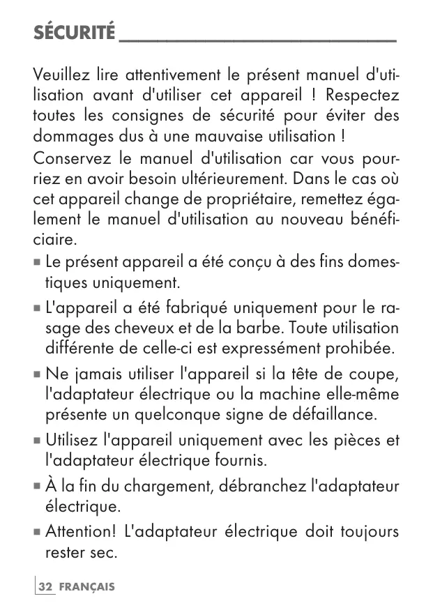 50-58 HRVATSKI 59-66 SÉCURITÉ______________________________ Veuillez lire attentivement le présent manuel d'utilisation avant d'utiliser cet appareil ! Respectez toutes les consignes de sécurité pour éviter des dommages dus à une mauvaise utilisation ! Conservez le manuel d'utilisation car vous pourriez en avoir besoin ultérieurement. Dans le cas où cet appareil change de propriétaire, remettez également le manuel d'utilisation au nouveau bénéficiaire. Le présent appareil a été conçu à des fins domestiques uniquement. L'appareil a été fabriqué uniquement pour le rasage des cheveux et de la barbe. Toute utilisation différente de celle-ci est expressément prohibée. Ne jamais utiliser l'appareil si la tête de coupe, l'adaptateur électrique ou la machine elle-même présente un quelconque signe de défaillance. Utilisez l'appareil uniquement avec les pièces et l'adaptateur électrique fournis. À la fin du chargement, débranchez l'adaptateur électrique. Attention! L'adaptateur électrique doit toujours rester sec.