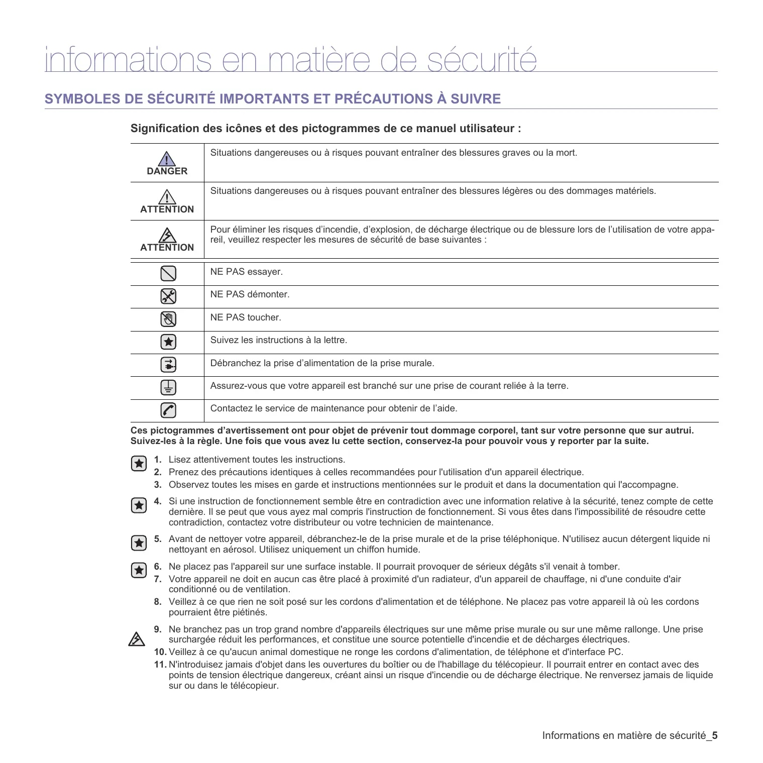 informations en matière de sécurité SYMBOLES DE SÉCURITÉ IMPORTANTS ET PRÉCAUTIONS À SUIVRE Signification des icônes et des pictogrammes de ce manuel utilisateur : Situations dangereuses ou à risques pouvant entraîner des blessures graves ou la mort. DANGER Situations dangereuses ou à risques pouvant entraîner des blessures légères ou des dommages matériels. ATTENTION ATTENTION Pour éliminer les risques d’incendie, d’explosion, de décharge électrique ou de blessure lors de l’utilisation de votre appareil, veuillez respecter les mesures de sécurité de base suivantes : NE PAS essayer. NE PAS démonter. NE PAS toucher. Suivez les instructions à la lettre. Débranchez la prise d’alimentation de la prise murale. Assurez-vous que votre appareil est branché sur une prise de courant reliée à la terre. Contactez le service de maintenance pour obtenir de l’aide. Ces pictogrammes d’avertissement ont pour objet de prévenir tout dommage corporel, tant sur votre personne que sur autrui. Suivez-les à la règle. Une fois que vous avez lu cette section, conservez-la pour pouvoir vous y reporter par la suite.
