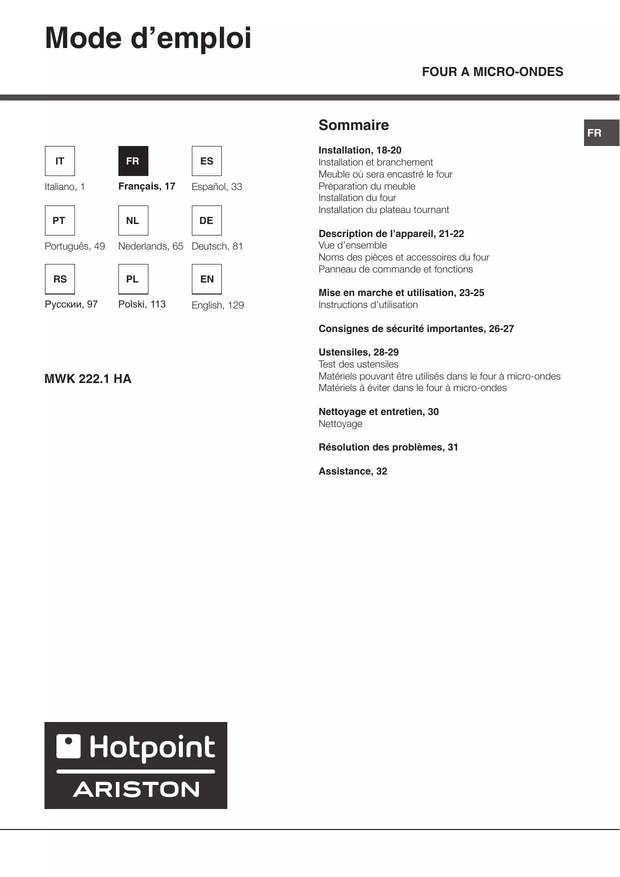 Retrouvez gratuitement la notice de l'appareil MWK222.1H HOTPOINT au format PDF.