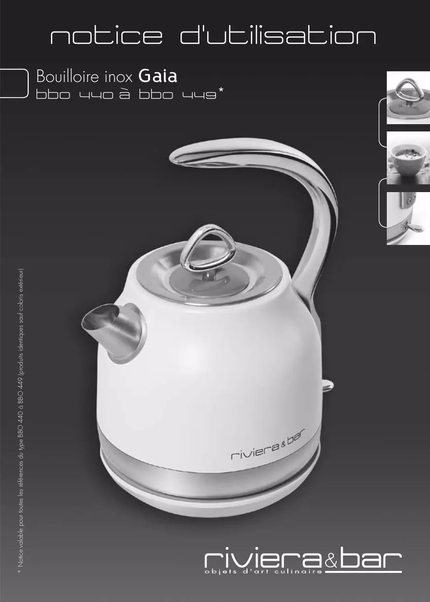 - Notice valable pour toutes les références du type BBO 440 à BBO 449 (produits identiques sauf coloris extérieur) notice d'utilisation Bouilloire inox Gaia bb0 440 a bb0 449* Avec cet appareil, vous avez fait l’acquisition d’un article de qualité, bénéficiant de toute l’expérience de Riviera & Bar dans le domaine de la préparation de boissons. Il répond aux critères de qualité Riviera & Bar : les meilleurs matériaux et composants ont été utilisés pour sa fabrication, et il a été soumis à des contrôles rigoureux. Nous souhaitons que son usage vous apporte entière satisfaction. Nous vous instructions fournissent, relatives à d’entretien. demandons de lire très attentivement les indiquées dans cette notice, car elles entre autres, des informations importantes la sécurité d’installation, d’utilisation et Gardez votre notice, vous pourriez avoir besoin de vous y référer dans le futur.