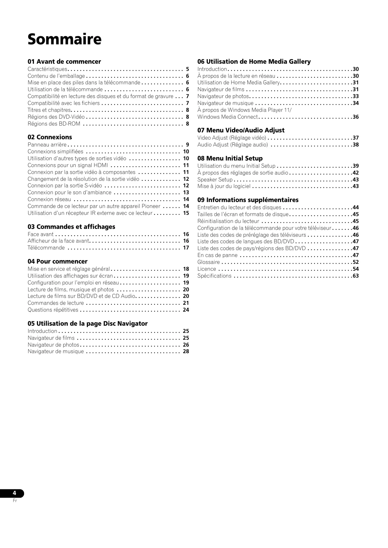 Introduction . . . . . . . . . . . . . . . . . . . . . . . . . . . . . . . . . . . . . . . . .30 À propos de la lecture en réseau . . . . . . . . . . . . . . . . . . . . . . . . .30 Utilisation de Home Media Gallery. . . . . . . . . . . . . . . . . . . . . . . .31 Navigateur de films . . . . . . . . . . . . . . . . . . . . . . . . . . . . . . . . . . .31 Navigateur de photos. . . . . . . . . . . . . . . . . . . . . . . . . . . . . . . . . .33 Navigateur de musique . . . . . . . . . . . . . . . . . . . . . . . . . . . . . . . .34 À propos de Windows Media Player 11/ Windows Media Connect . . . . . . . . . . . . . . . . . . . . . . . . . . . . . . .36 07 Menu Video/Audio Adjust 02 Connexions Panneau arrière . . . . . . . . . . . . . . . . . . . . . . . . . . . . . . . . . . . . . . 9 Connexions simplifiées . . . . . . . . . . . . . . . . . . . . . . . . . . . . . . . 10 Utilisation d’autres types de sorties vidéo . . . . . . . . . . . . . . . . . 10 Connexions pour un signal HDMI . . . . . . . . . . . . . . . . . . . . . . . 11 Connexion par la sortie vidéo à composantes . . . . . . . . . . . . . . 11 Changement de la résolution de la sortie vidéo . . . . . . . . . . . . . 12 Connexion par la sortie S-vidéo . . . . . . . . . . . . . . . . . . . . . . . . . 12 Connexion pour le son d’ambiance . . . . . . . . . . . . . . . . . . . . . . 13 Connexion réseau . . . . . . . . . . . . . . . . . . . . . . . . . . . . . . . . . . . 14 Commande de ce lecteur par un autre appareil Pioneer . . . . . . 14 Utilisation d’un récepteur IR externe avec ce lecteur . . . . . . . . . 15 03 Commandes et affichages Face avant . . . . . . . . . . . . . . . . . . . . . . . . . . . . . . . . . . . . . . . . . 16 Afficheur de la face avant. . . . . . . . . . . . . . . . . . . . . . . . . . . . . . 16 Télécommande . . . . . . . . . . . . . . . . . . . . . . . . . . . . . . . . . . . . . 17 04 Pour commencer Mise en service et réglage général . . . . . . . . . . . . . . . . . . . . . . . Utilisation des affichages sur écran . . . . . . . . . . . . . . . . . . . . . . Configuration pour l’emploi en réseau . . . . . . . . . . . . . . . . . . . . Lecture de films, musique et photos . . . . . . . . . . . . . . . . . . . . . Lecture de films sur BD/DVD et de CD Audio. . . . . . . . . . . . . . . Commandes de lecture . . . . . . . . . . . . . . . . . . . . . . . . . . . . . . . Questions répétitives . . . . . . . . . . . . . . . . . . . . . . . . . . . . . . . . .