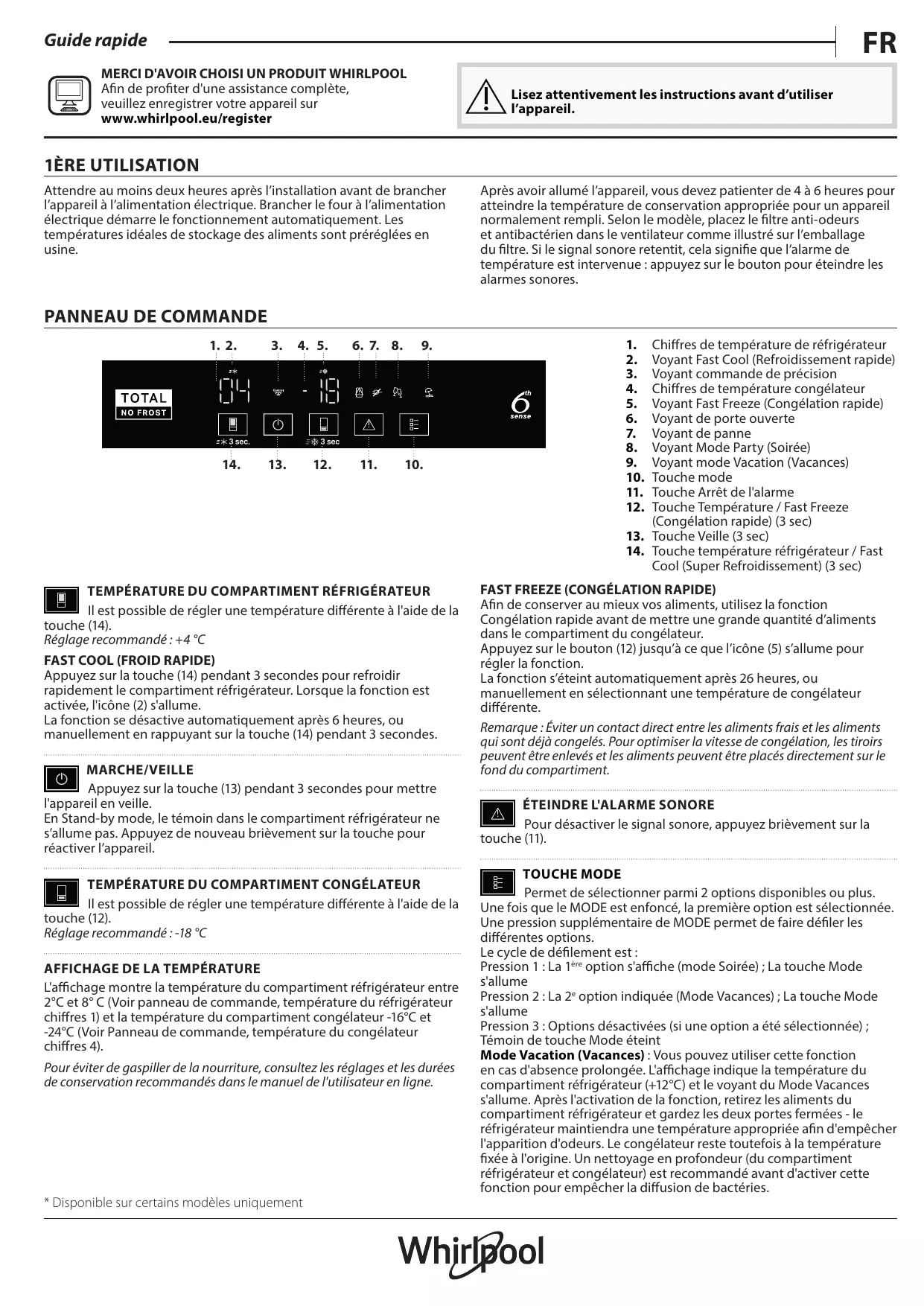 Appuyez sur la touche (14) pendant 3 secondes pour refroidir rapidement le compartiment réfrigérateur. Lorsque la fonction est activée, l'icône (2) s'allume.
