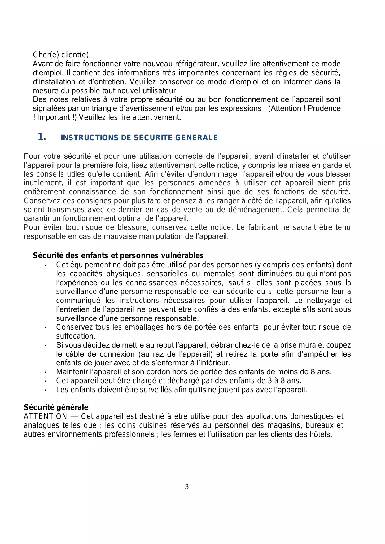Pour éviter tout risque de blessure, conservez cette notice. Le fabricant ne saurait être tenu responsable en cas de mauvaise manipulation de l’appareil. Sécurité des enfants et personnes vulnérables • Cet équipement ne doit pas être utilisé par des personnes (y compris des enfants) dont les capacités physiques, sensorielles ou mentales sont diminuées ou qui n’ont pas l’expérience ou les connaissances nécessaires, sauf si elles sont placées sous la surveillance d’une personne responsable de leur sécurité ou si cette personne leur a communiqué les instructions nécessaires pour utiliser l’appareil. Le nettoyage et l’entretien de l’appareil ne peuvent être confiés à des enfants, excepté s’ils sont sous surveillance d’une personne responsable. • Conservez tous les emballages hors de portée des enfants, pour éviter tout risque de suffocation. • Si vous décidez de mettre au rebut l’appareil, débranchez-le de la prise murale, coupez le câble de connexion (au raz de l’appareil) et retirez la porte afin d’empêcher les enfants de jouer avec et de s’enfermer à l’intérieur. • Maintenir l’appareil et son cordon hors de portée des enfants de moins de 8 ans. • Cet appareil peut être chargé et déchargé par des enfants de 3 à 8 ans. • Les enfants doivent être surveillés afin qu’ils ne jouent pas avec l’appareil. Sécurité générale ATTENTION — Cet appareil est destiné à être utilisé pour des applications domestiques et analogues telles que : les coins cuisines réservés au personnel des magasins, bureaux et autres environnements professionnels ; les fermes et l’utilisation par les clients des hôtels,