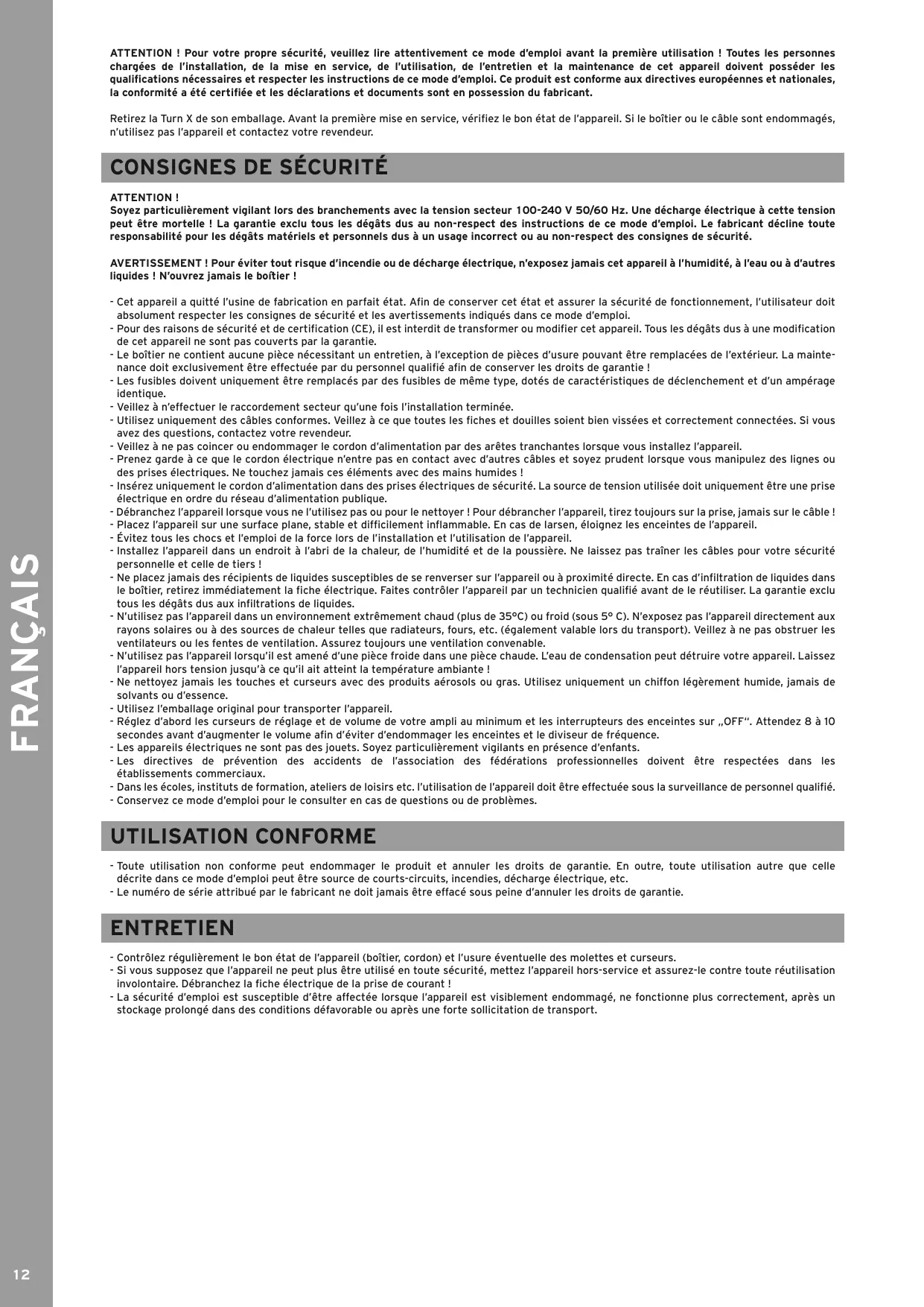 FRANÇAIS AVERTISSEMENT ! Pour éviter tout risque d’incendie ou de décharge électrique, n’exposez jamais cet appareil à l’humidité, à l’eau ou à d’autres liquides ! N’ouvrez jamais le boîtier ! - Cet appareil a quitté l’usine de fabrication en parfait état. Afin de conserver cet état et assurer la sécurité de fonctionnement, l’utilisateur doit absolument respecter les consignes de sécurité et les avertissements indiqués dans ce mode d’emploi. - Pour des raisons de sécurité et de certification (CE), il est interdit de transformer ou modifier cet appareil. Tous les dégâts dus à une modification de cet appareil ne sont pas couverts par la garantie. - Le boîtier ne contient aucune pièce nécessitant un entretien, à l’exception de pièces d’usure pouvant être remplacées de l’extérieur. La maintenance doit exclusivement être effectuée par du personnel qualifié afin de conserver les droits de garantie ! - Les fusibles doivent uniquement être remplacés par des fusibles de même type, dotés de caractéristiques de déclenchement et d’un ampérage identique. - Veillez à n’effectuer le raccordement secteur qu’une fois l’installation terminée. - Utilisez uniquement des câbles conformes. Veillez à ce que toutes les fiches et douilles soient bien vissées et correctement connectées. Si vous avez des questions, contactez votre revendeur. - Veillez à ne pas coincer ou endommager le cordon d’alimentation par des arêtes tranchantes lorsque vous installez l’appareil. - Prenez garde à ce que le cordon électrique n’entre pas en contact avec d’autres câbles et soyez prudent lorsque vous manipulez des lignes ou des prises électriques. Ne touchez jamais ces éléments avec des mains humides ! - Insérez uniquement le cordon d’alimentation dans des prises électriques de sécurité. La source de tension utilisée doit uniquement être une prise électrique en ordre du réseau d’alimentation publique. - Débranchez l’appareil lorsque vous ne l’utilisez pas ou pour le nettoyer ! Pour débrancher l’appareil, tirez toujours sur la prise, jamais sur le câble ! - Placez l’appareil sur une surface plane, stable et difficilement inflammable. En cas de larsen, éloignez les enceintes de l’appareil. - Évitez tous les chocs et l’emploi de la force lors de l’installation et l’utilisation de l’appareil. - Installez l’appareil dans un endroit à l’abri de la chaleur, de l’humidité et de la poussière. Ne laissez pas traîner les câbles pour votre sécurité personnelle et celle de tiers ! - Ne placez jamais des récipients de liquides susceptibles de se renverser sur l’appareil ou à proximité directe. En cas d’infiltration de liquides dans le boîtier, retirez immédiatement la fiche électrique. Faites contrôler l’appareil par un technicien qualifié avant de le réutiliser. La garantie exclu tous les dégâts dus aux infiltrations de liquides. - N’utilisez pas l’appareil dans un environnement extrêmement chaud (plus de 35°C) ou froid (sous 5° C). N’exposez pas l’appareil directement aux rayons solaires ou à des sources de chaleur telles que radiateurs, fours, etc. (également valable lors du transport). Veillez à ne pas obstruer les ventilateurs ou les fentes de ventilation. Assurez toujours une ventilation convenable. - N’utilisez pas l’appareil lorsqu’il est amené d’une pièce froide dans une pièce chaude. L’eau de condensation peut détruire votre appareil. Laissez l’appareil hors tension jusqu’à ce qu’il ait atteint la température ambiante ! - Ne nettoyez jamais les touches et curseurs avec des produits aérosols ou gras. Utilisez uniquement un chiffon légèrement humide, jamais de solvants ou d’essence. - Utilisez l’emballage original pour transporter l’appareil. - Réglez d’abord les curseurs de réglage et de volume de votre ampli au minimum et les interrupteurs des enceintes sur „OFF“. Attendez 8 à 10 secondes avant d’augmenter le volume afin d’éviter d’endommager les enceintes et le diviseur de fréquence. - Les appareils électriques ne sont pas des jouets. Soyez particulièrement vigilants en présence d’enfants. - Les directives de prévention des accidents de l’association des fédérations professionnelles doivent être respectées dans les établissements commerciaux. - Dans les écoles, instituts de formation, ateliers de loisirs etc. l’utilisation de l’appareil doit être effectuée sous la surveillance de personnel qualifié. - Conservez ce mode d’emploi pour le consulter en cas de questions ou de problèmes.