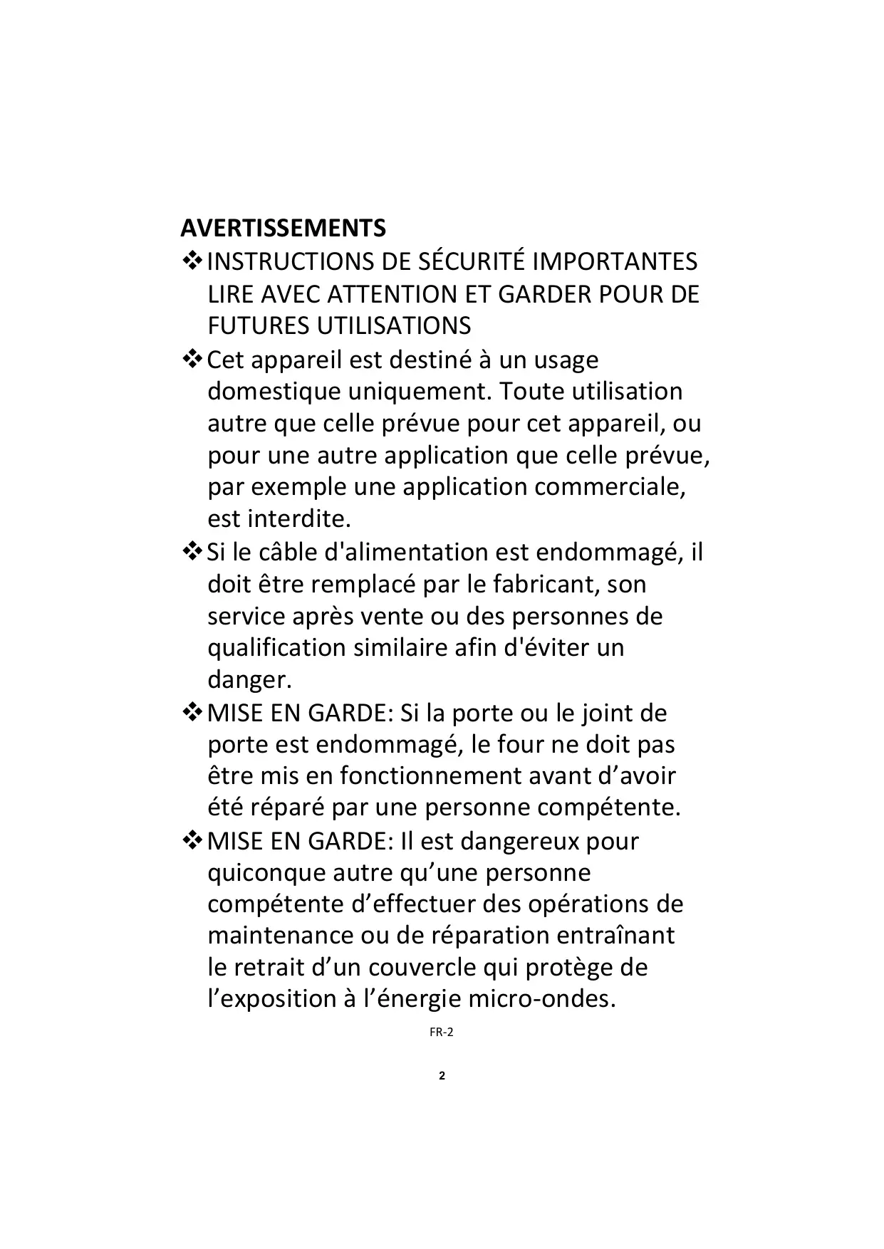 LIRE AVEC ATTENTION ET GARDER POUR DE FUTURES UTILISATIONS Cet appareil est destiné à un usage domestique uniquement. Toute utilisation autre que celle prévue pour cet appareil, ou pour une autre application que celle prévue, par exemple une application commerciale, est interdite. Si le câble d'alimentation est endommagé, il doit être remplacé par le fabricant, son service après vente ou des personnes de qualification similaire afin d'éviter un danger. MISE EN GARDE: Si la porte ou le joint de porte est endommagé, le four ne doit pas être mis en fonctionnement avant d’avoir été réparé par une personne compétente. MISE EN GARDE: Il est dangereux pour quiconque autre qu’une personne compétente d’effectuer des opérations de maintenance ou de réparation entraînant le retrait d’un couvercle qui protège de l’exposition à l’énergie micro-ondes. FR-2