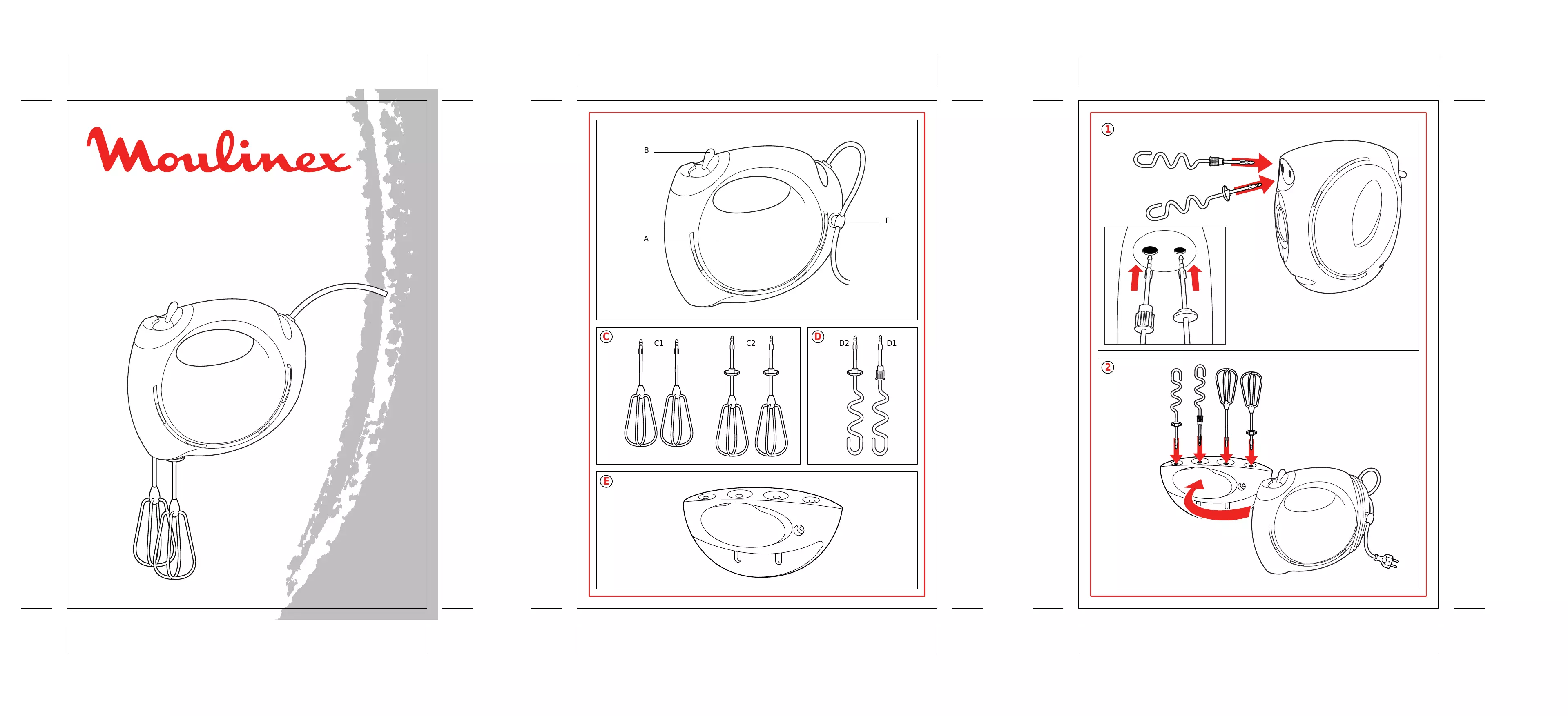 Description A Corps de l’appareil B Commande “Easy” Accessoires (selon modèles) C 1 jeu de fouets “Max” (C1 ou C2) D 1 jeu de malaxeurs D1 malaxeur droit D2 malaxeur gauche E Support mural et rangement des accessoires F Ventouse pour rangement du cordon