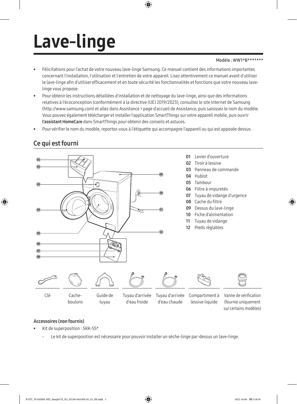 Félicitations pour l'achat de votre nouveau lave-linge Samsung. Ce manuel contient des informations importantes concernant l'installation, l'utilisation et l'entretien de votre appareil. Lisez attentivement ce manuel avant d'utiliser le lave-linge afin d'utiliser efficacement et en toute sécurité les fonctionnalités et fonctions que votre nouveau lavelinge vous propose.
