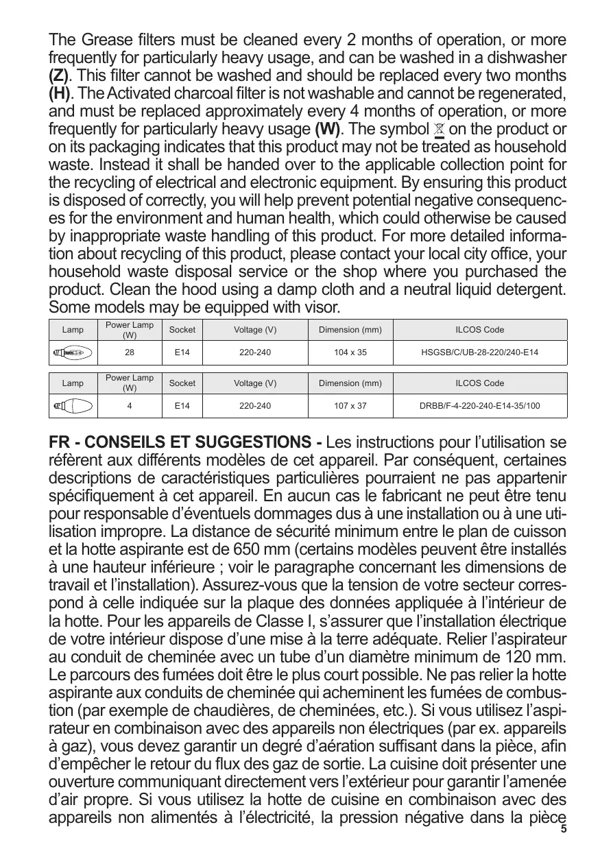 ne doit pas dépasser 0,04 mbar afin d’éviter que la hotte ne réaspire les fumées dans la pièce. Ne pas évacuer l’air à travers un tube flexible utilisé pour l’aspiration des fumées des appareils alimentés au gaz ou avec d’autres combustibles (ne pas utiliser avec des appareils ayant une seule sortie d’air dans la pièce). Si le cordon d’alimentation est endommagé, veuillez le faire remplacer par le fabricant ou par un service après-vente agréé pour éviter tout risque d’accident. Si les instructions d’installation du plan de cuisson à gaz spécifient une distance supérieure à celle indiquée ci-dessus, veuillez impérativement en tenir compte. Toutes les normes concernant l’évacuation de l’air doivent être respectées. Utiliser exclusivement des vis et des petites pièces du type adapté pour la hotte. Attention : toute installation des vis et des dispositifs de fixation non conforme aux présentes instructions peut entraîner des risques de décharges électriques. Brancher la hotte à l’alimentation de secteur avec un interrupteur bipolaire ayant une ouverture des contacts d’au moins 3 mm. Cette hotte aspirante a été conçue exclusivement pour un usage domestique, dans le but d’éliminer les odeurs de cuisine. Ne jamais utiliser la hotte pour des objectifs différents de ceux pour lesquels elle a été conçue. Ne jamais laisser un feu vif allumé sous la hotte lorsque celle-ci est en fonction. Régler l’intensité du feu de manière à l’orienter exclusivement vers le fond de la casserole, en vous assurant qu’il ne déborde pas sur les côtés. Contrôler constamment les friteuses durant leur utilisation : l’huile surchauffée risque de s’incendier. Ne pas flamber des mets sous la hotte : sous risque de provoquer un incendie. Cet appareil n’est pas destiné à être utilisé par des enfants d’un âge inférieur à 8 ans, ni par des personnes dont les capacités physiques, sensorielles ou mentales sont diminuées ou qui ont une expérience et des connaissances insuffisantes, à moins que ces enfants ou ces personnes ne soient attentivement surveillés et instruits sur la manière d’utiliser cet appareil en sécurité et sur les dangers que cela comporte. Assurez-vous que les enfants ne jouent pas avec cet appareil. Le nettoyage et l’entretien de la part de l’utilisateur ne doivent pas être effectués par des enfants, à moins que ce ne soit sous la surveillance d’une personne responsable. Cet appareil n’est pas destiné à être utilisé par des personnes (enfants compris) dont les capacités physiques, sensorielles ou mentales sont diminuées ou ayant une expérience et des connaissances insuffisantes, à moins que ces personnes ne soient attentivement surveillées et instruites par un responsable de leur sécurité. ATTENTION : les parties accessibles peuvent devenir très chaudes durant l’utilisation des appareils de cuisson. Le symbole marqué sur le produit ou sur son emballage indique que ce produit ne peut pas être éliminé comme déchet ménager normal. Lorsque ce produit doit être éliminé, veuillez le remettre à un centre de collecte prévu pour le recyclage du matériel électrique et électronique. En vous assurant que cet appareil est éliminé correctement, vous participez à prévenir des conséquences potentiellement négatives pour l’environnement et pour la santé, qui risqueraient de se présenter en cas d’élimination inap6 propriée. Pour toute information supplémentaire sur le recyclage de ce produit, contactez votre municipalité, votre déchetterie locale ou le magasin où vous avez acheté ce produit. Avant d’effectuer toute opération de nettoyage et d’entretien, éteindre ou débrancher l’appareil du secteur. Nettoyer et/ou remplacer les filtres après le délai indiqué (danger d’incendie). Effectuer le nettoyage selon les instructions, sous risque d’incendie. Nettoyer les filtres à graisse tous les 2 mois de fonctionnement ou plus souvent en cas d’utilisation particulièrement intense. Ces filtres peuvent être lavés au lave-vaisselle (Z). Ce filtre ne peut être lavé; il est indispensable de le changer tous les deux mois (H). Le filtre à charbon actif ne peut être ni lavé ni régénéré et il doit être remplacé environ tous les 4 mois de fonctionnement ou plus souvent en cas d’utilisation particulièrement intense (W). Nettoyer la hotte avec un chiffon humide et un détergent liquide neutre. Certains modeles peut être équipés avec visière. Ampoule Ampoule Absorption (W) Culot Voltage (V) Dimensions (mm) Code ILCOS