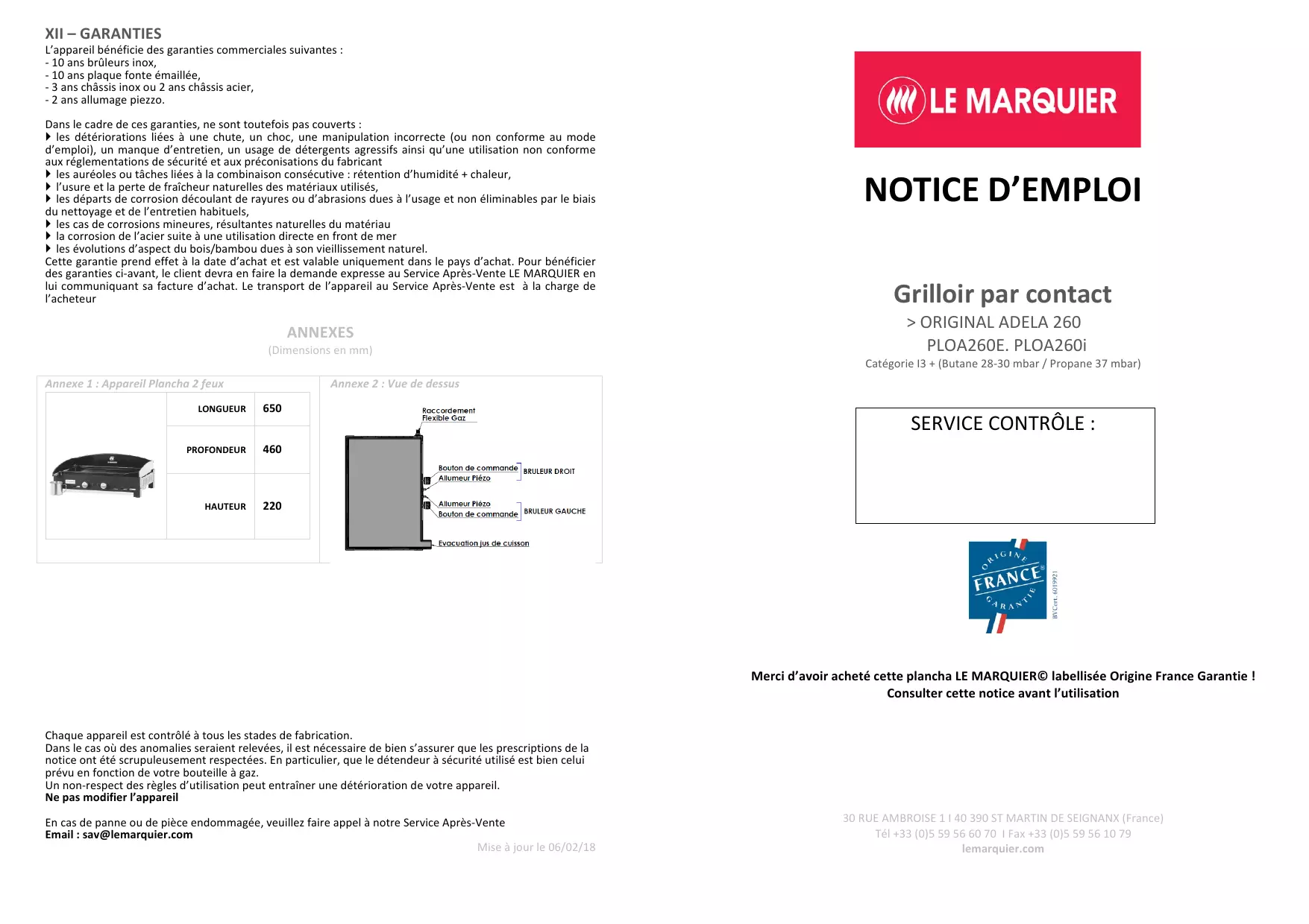 SERVICE CONTRÔLE : Merci d’avoir acheté cette plancha LE MARQUIER© labellisée Origine France Garantie ! Consulter cette notice avant l’utilisation Chaque appareil est contrôlé à tous les stades de fabrication. Dans le cas où des anomalies seraient relevées, il est nécessaire de bien s’assurer que les prescriptions de la notice ont été scrupuleusement respectées. En particulier, que le détendeur à sécurité utilisé est bien celui prévu en fonction de votre bouteille à gaz. Un non-respect des règles d’utilisation peut entraîner une détérioration de votre appareil. Ne pas modifier l’appareil En cas de panne ou de pièce endommagée, veuillez faire appel à notre Service Après-Vente Email : sav@lemarquier.com Mise à jour le 06/02/18 30 RUE AMBROISE 1 I 40 390 ST MARTIN DE SEIGNANX (France) Tél +33 (0)5 59 56 60 70 I Fax +33 (0)5 59 56 10 79 lemarquier.com