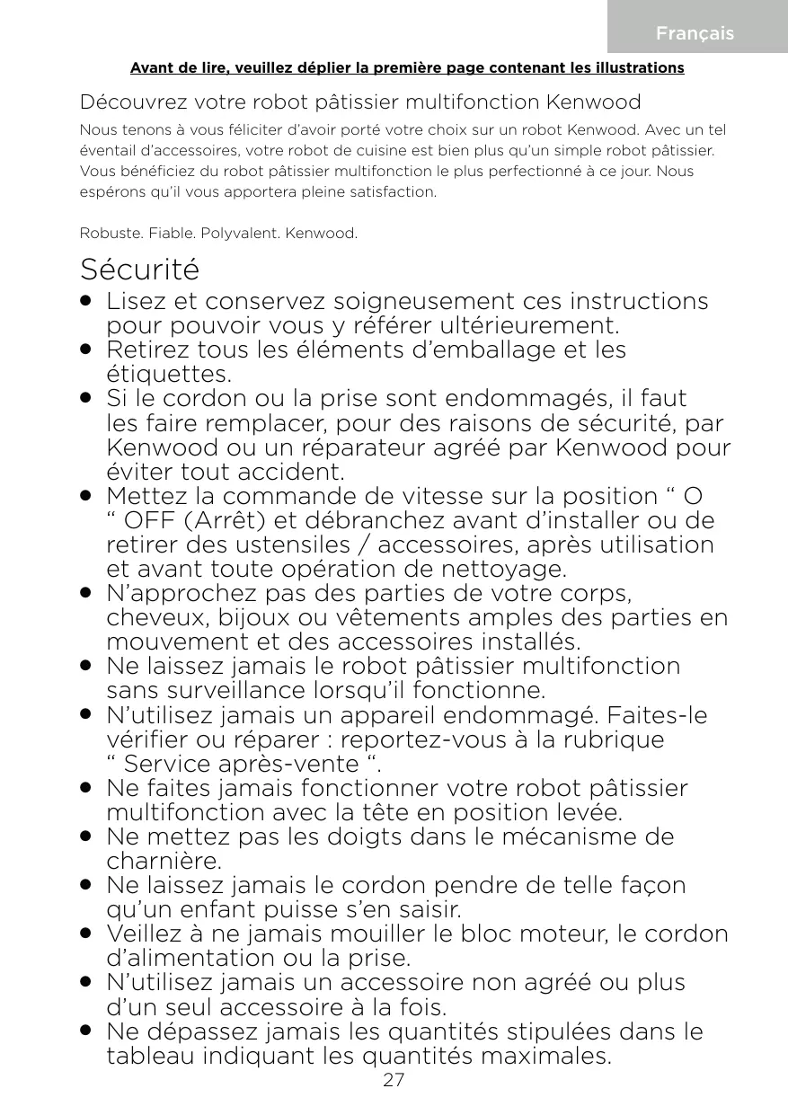 Lisez et conservez soigneusement ces instructions pour pouvoir vous y référer ultérieurement. O Retirez tous les éléments d’emballage et les étiquettes. O Si le cordon ou la prise sont endommagés, il faut les faire remplacer, pour des raisons de sécurité, par Kenwood ou un réparateur agréé par Kenwood pour éviter tout accident. O Mettez la commande de vitesse sur la position “ O “ OFF (Arrêt) et débranchez avant d’installer ou de retirer des ustensiles / accessoires, après utilisation et avant toute opération de nettoyage. O N’approchez pas des parties de votre corps, cheveux, bijoux ou vêtements amples des parties en mouvement et des accessoires installés. O Ne laissez jamais le robot pâtissier multifonction sans surveillance lorsqu’il fonctionne. O N’utilisez jamais un appareil endommagé. Faites-le vérifier ou réparer : reportez-vous à la rubrique “ Service après-vente “. O Ne faites jamais fonctionner votre robot pâtissier multifonction avec la tête en position levée. O Ne mettez pas les doigts dans le mécanisme de charnière. O Ne laissez jamais le cordon pendre de telle façon qu’un enfant puisse s’en saisir. O Veillez à ne jamais mouiller le bloc moteur, le cordon d’alimentation ou la prise. O N’utilisez jamais un accessoire non agréé ou plus d’un seul accessoire à la fois. O Ne dépassez jamais les quantités stipulées dans le tableau indiquant les quantités maximales. O