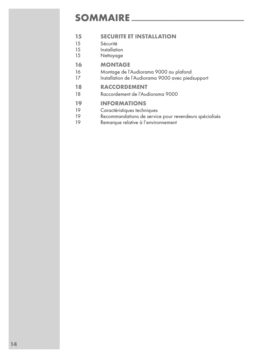 SECURITE ET INSTALLATION -------------------------------Sécurité Veuillez respecter les recommandations suivantes lors de l’installation de l’Audiorama 9000 : Ces haut-parleurs sont conçus pour la lecture de signaux audio. Toute autre utilisation est formellement exclue. Ces haut-parleurs sont conçus pour une utilisation dans des endroits secs. Protégez les haut-parleurs des projections d'eau. Ne placez pas les haut-parleurs à proximité directe d’un chauffage ou en plein soleil. Si vous installez l'Audiorama 9000 sur un pied support, assurez vous que la surface sous le pied est plane. Ne posez pas de récipients contenant des liquides (vases ou autres) sur les haut-parleurs. Le récipient peut se renverser et le liquide endommager les haut-parleurs. Ne posez pas d'objets enflammés comme des bougies sur les hautparleurs. N’ouvrez en aucun cas l’intérieur du haut-parleur. La garantie du fabricant ne couvre aucun dégât occasionné par des manipulations inadéquates.