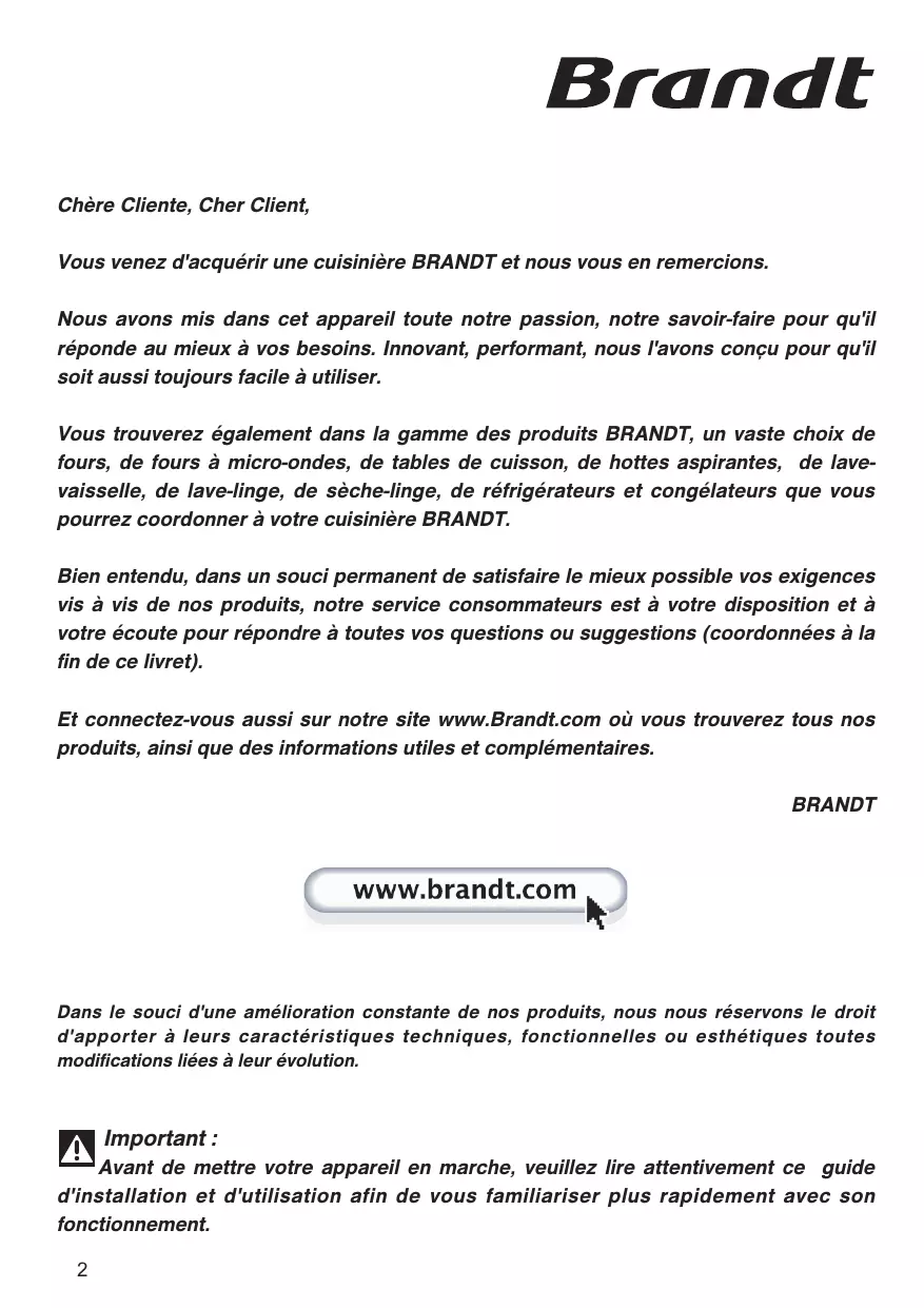 GUIDE D'UTILISATION Cuisinière Chère Cliente, Cher Client, Vous venez d'acquérir une cuisinière BRANDT et nous vous en remercions. Nous avons mis dans cet appareil toute notre passion, notre savoir-faire pour qu'il réponde au mieux à vos besoins. Innovant, performant, nous l'avons conçu pour qu'il soit aussi toujours facile à utiliser. Vous trouverez également dans la gamme des produits BRANDT, un vaste choix de fours, de fours à micro-ondes, de tables de cuisson, de hottes aspirantes, de lavevaisselle, de lave-linge, de sèche-linge, de réfrigérateurs et congélateurs que vous pourrez coordonner à votre cuisinière BRANDT. Bien entendu, dans un souci permanent de satisfaire le mieux possible vos exigences vis à vis de nos produits, notre service consommateurs est à votre disposition et à votre écoute pour répondre à toutes vos questions ou suggestions (coordonnées à la fin de ce livret). Et connectez-vous aussi sur notre site www.Brandt.com où vous trouverez tous nos produits, ainsi que des informations utiles et complémentaires. BRANDT Dans le souci d'une amélioration constante de nos produits, nous nous réservons le droit d'apporter à leurs caractéristiques techniques, fonctionnelles ou esthétiques toutes modifications liées à leur évolution. Important : Avant de mettre votre appareil en marche, veuillez lire attentivement ce guide d'installation et d'utilisation afin de vous familiariser plus rapidement avec son fonctionnement.