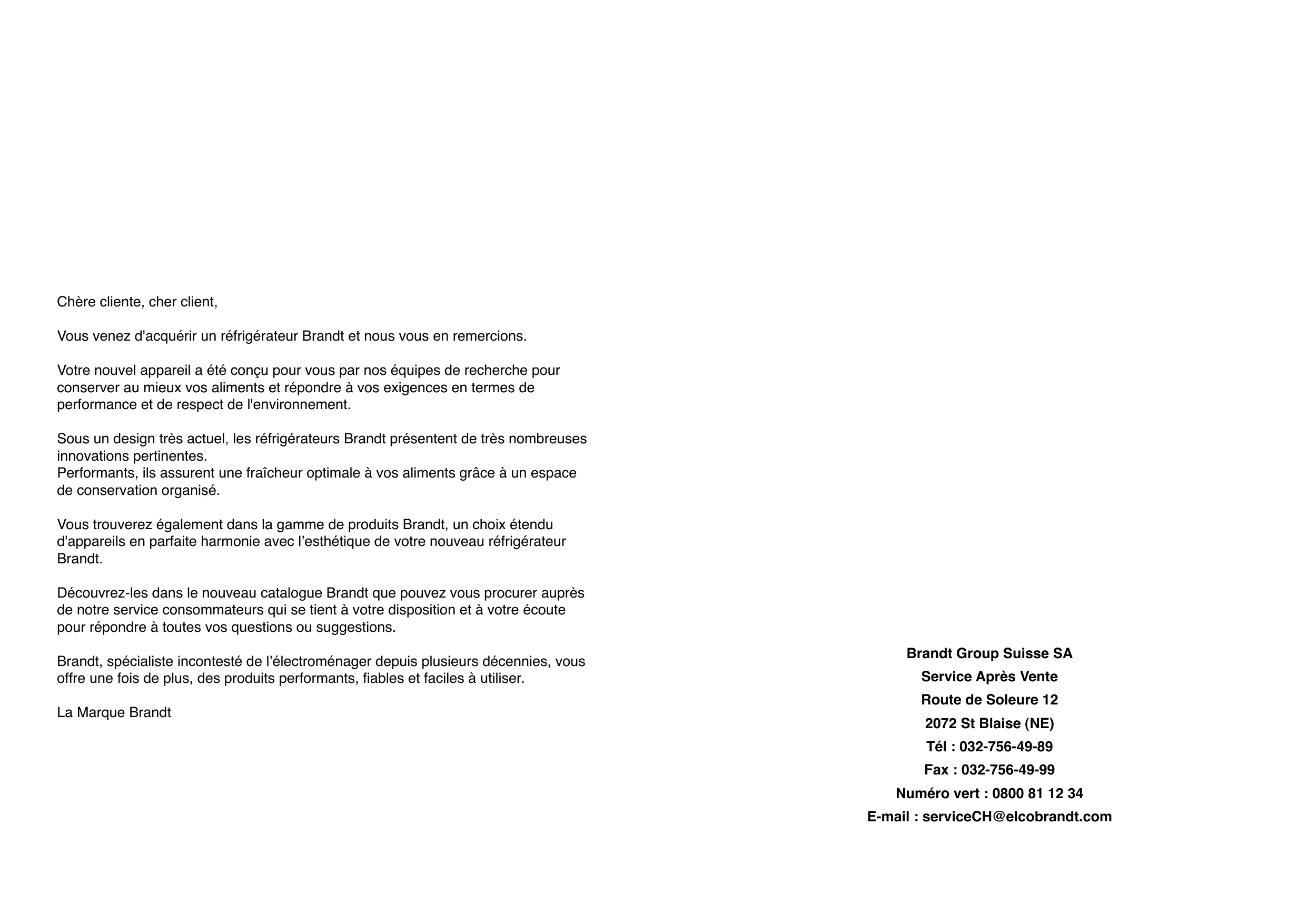 Brandt Group Suisse SA Service Après Vente Route de Soleure 12 2072 St Blaise (NE) Tél : 032-756-49-89 Fax : 032-756-49-99 Numéro vert : 0800 81 12 34 E-mail : serviceCH@elcobrandt.com