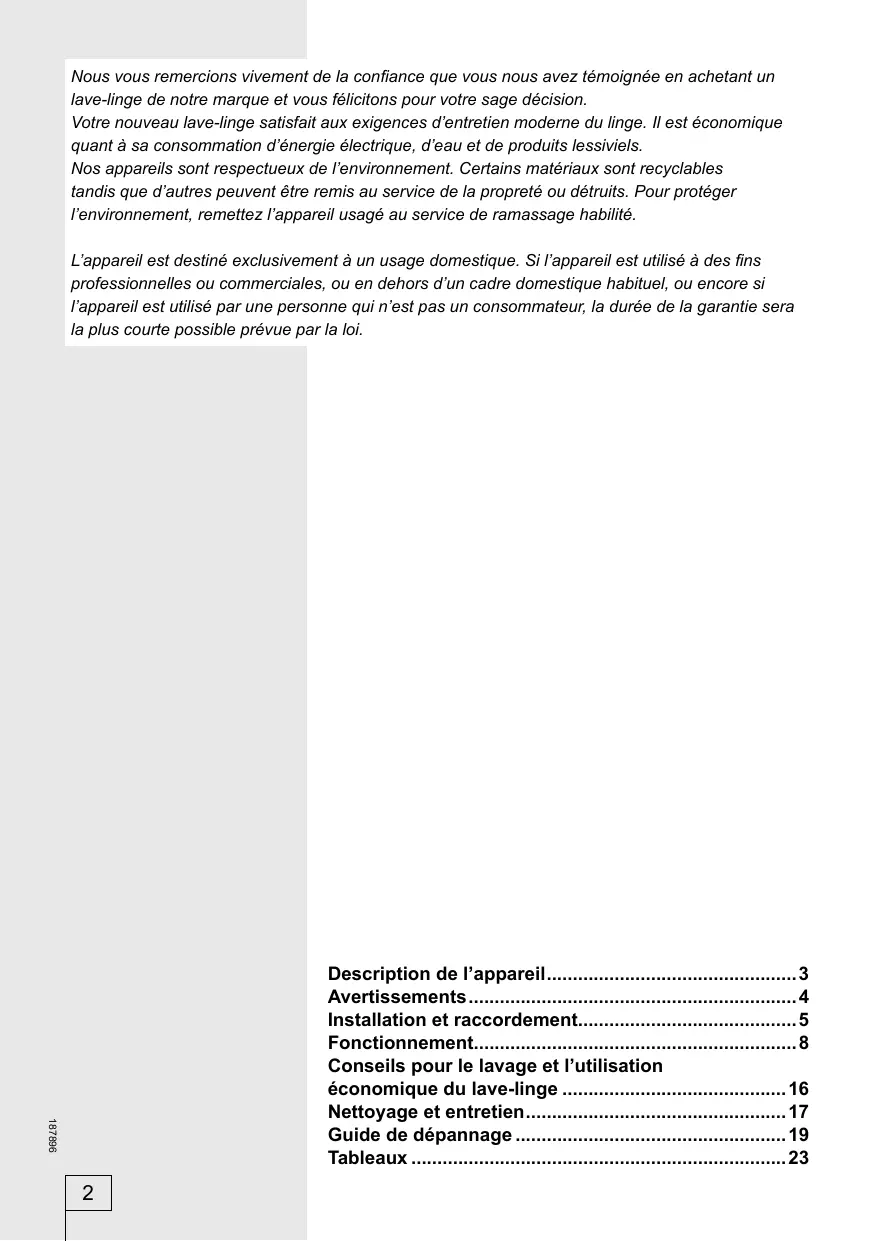 Nous vous remercions vivement de la confiance que vous nous avez témoignée en achetant un lave-linge de notre marque et vous félicitons pour votre sage décision. Votre nouveau lave-linge satisfait aux exigences d’entretien moderne du linge. Il est économique quant à sa consommation d’énergie électrique, d’eau et de produits lessiviels. Nos appareils sont respectueux de l’environnement. Certains matériaux sont recyclables tandis que d’autres peuvent être remis au service de la propreté ou détruits. Pour protéger l’environnement, remettez l’appareil usagé au service de ramassage habilité. L’appareil est destiné exclusivement à un usage domestique. Si l’appareil est utilisé à des fins professionnelles ou commerciales, ou en dehors d’un cadre domestique habituel, ou encore si l’appareil est utilisé par une personne qui n’est pas un consommateur, la durée de la garantie sera la plus courte possible prévue par la loi.