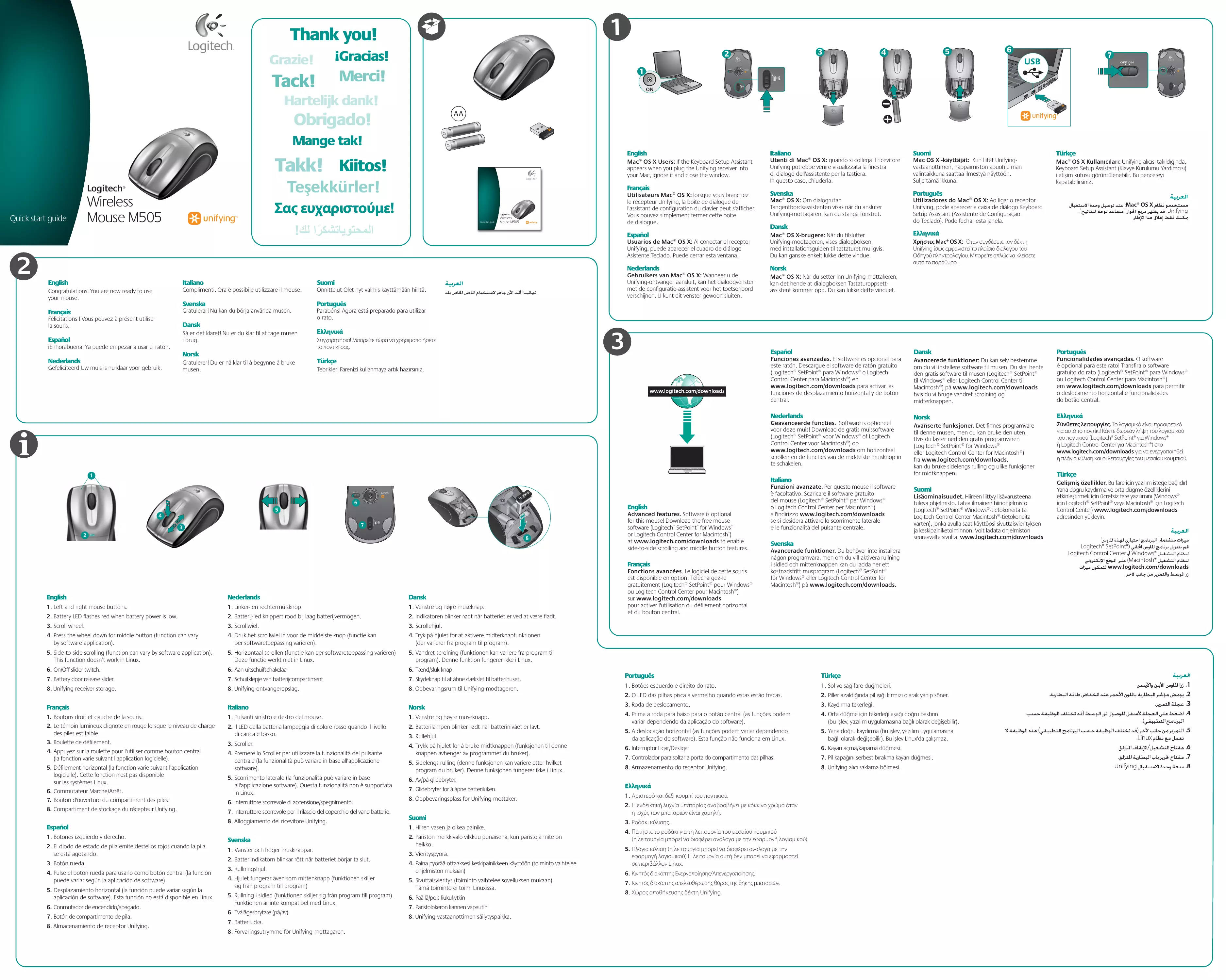 5. Scorrimento laterale (la funzionalità può variare in base all'applicazione software). Questa funzionalità non è supportata in Linux. 5. Déplacez tout objet métallique se trouvant entre la souris et le récepteur Unifying. 6. Si le récepteur Unifying est branché dans un hub USB, branchez-le plutôt directement sur l'ordinateur. 7. Branchez le récepteur Unifying dans un port USB plus proche de la souris ou consultez le site www.logitech.com/usbextender pour obtenir un support d'extension USB qui permettra de rapprocher le récepteur Unifying de la souris. Español El puntero no se mueve o realiza movimientos erráticos 1. ¿Está encendido? 2. Compruebe el receptor Unifying; cambie de puerto. Pour en savoir plus et pour télécharger le logiciel, rendez-vous sur www.logitech.com/unifying * PC: Cliquez sur Démarrer / Tous les programmes / Logitech / Unifying / Logitech Unifying Software Mac: Cliquez sur Applications / Utilitaires / Logitech Unifying Software