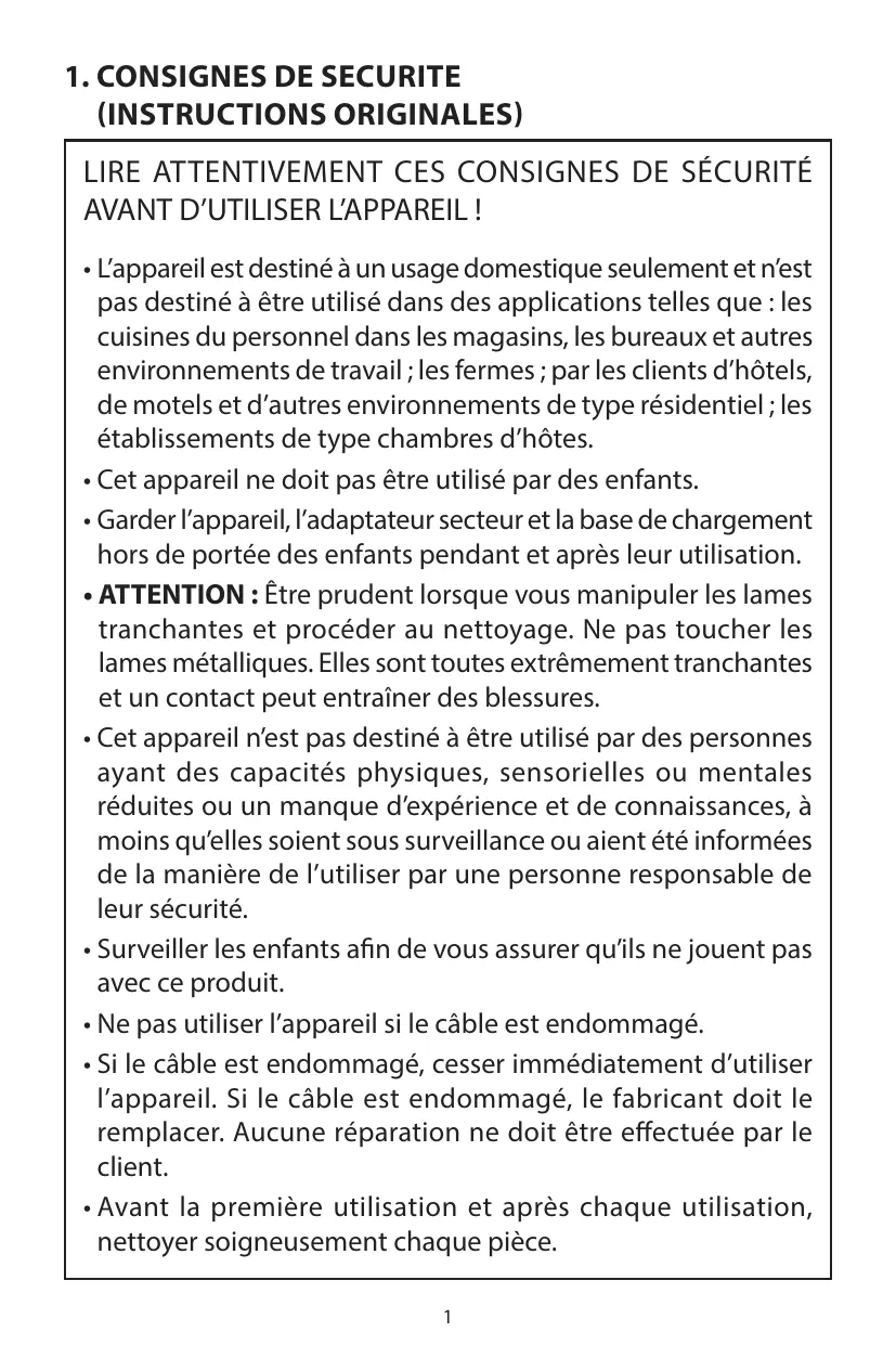 • L’appareil est destiné à un usage domestique seulement et n’est pas destiné à être utilisé dans des applications telles que : les cuisines du personnel dans les magasins, les bureaux et autres environnements de travail ; les fermes ; par les clients d’hôtels, de motels et d’autres environnements de type résidentiel ; les établissements de type chambres d’hôtes. • Cet appareil ne doit pas être utilisé par des enfants. • Garder l’appareil, l’adaptateur secteur et la base de chargement hors de portée des enfants pendant et après leur utilisation. • ATTENTION : Être prudent lorsque vous manipuler les lames tranchantes et procéder au nettoyage. Ne pas toucher les lames métalliques. Elles sont toutes extrêmement tranchantes et un contact peut entraîner des blessures. • Cet appareil n’est pas destiné à être utilisé par des personnes ayant des capacités physiques, sensorielles ou mentales réduites ou un manque d’expérience et de connaissances, à moins qu’elles soient sous surveillance ou aient été informées de la manière de l’utiliser par une personne responsable de leur sécurité. • Surveiller les enfants afin de vous assurer qu’ils ne jouent pas avec ce produit. • Ne pas utiliser l’appareil si le câble est endommagé. • Si le câble est endommagé, cesser immédiatement d’utiliser l’appareil. Si le câble est endommagé, le fabricant doit le remplacer. Aucune réparation ne doit être effectuée par le client. • Avant la première utilisation et après chaque utilisation, nettoyer soigneusement chaque pièce. 1