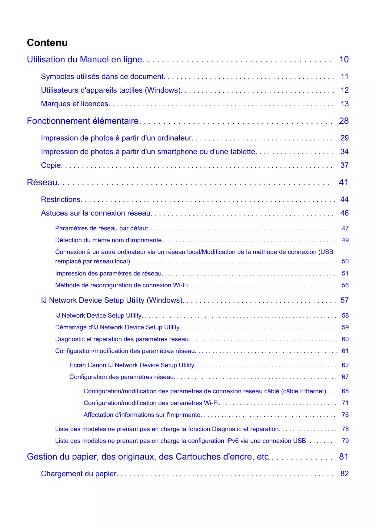 IJ Network Device Setup Utility. 58 Démarrage d'IJ Network Device Setup Utility 59 Diagnostic et réparation des paramètres réseau 60 Configuration/modification des paramètres réseau 61
