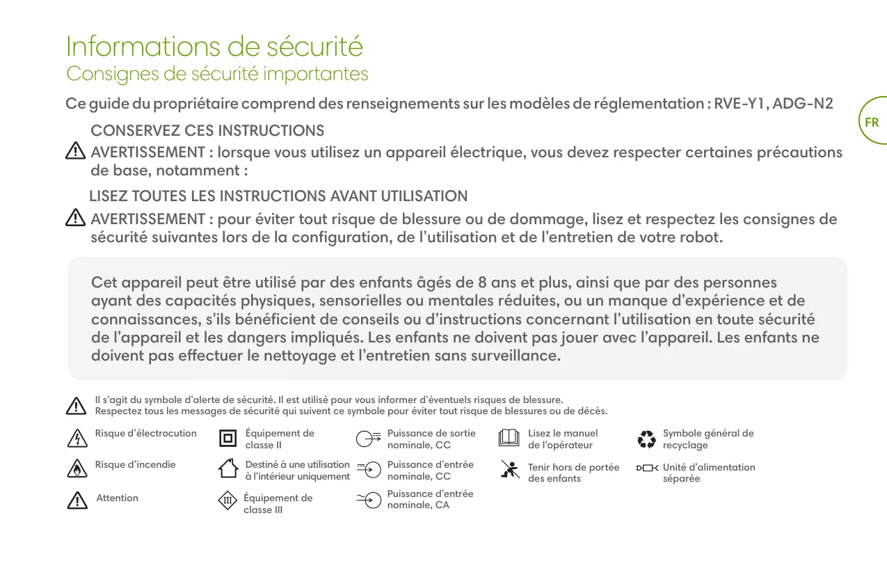 Lift up on the canister lid to open. CONSERVEZ CES INSTRUCTIONS AVERTISSEMENT : lorsque vous utilisez un appareil électrique, vous devez respecter certaines précautions de base, notamment : LISEZ TOUTES LES INSTRUCTIONS AVANT UTILISATION AVERTISSEMENT : pour éviter tout risque de blessure ou de dommage, lisez et respectez les consignes de sécurité suivantes lors de la configuration, de l’utilisation et de l’entretien de votre robot. Cet appareil peut être utilisé par des enfants âgés de 8 ans et plus, ainsi que par des personnes ayant des capacités physiques, sensorielles ou mentales réduites, ou un manque d’expérience et de connaissances, s'ils bénéficient de conseils ou d’instructions concernant l’utilisation en toute sécurité de l’appareil et les dangers impliqués. Les enfants ne doivent pas jouer avec l’appareil. Les enfants ne doivent pas effectuer le nettoyage et l’entretien sans surveillance. Il s’agit du symbole d’alerte de sécurité. Il est utilisé pour vous informer d’éventuels risques de blessure. Respectez tous les messages de sécurité qui suivent ce symbole pour éviter tout risque de blessures ou de décès. Risque d’électrocution
