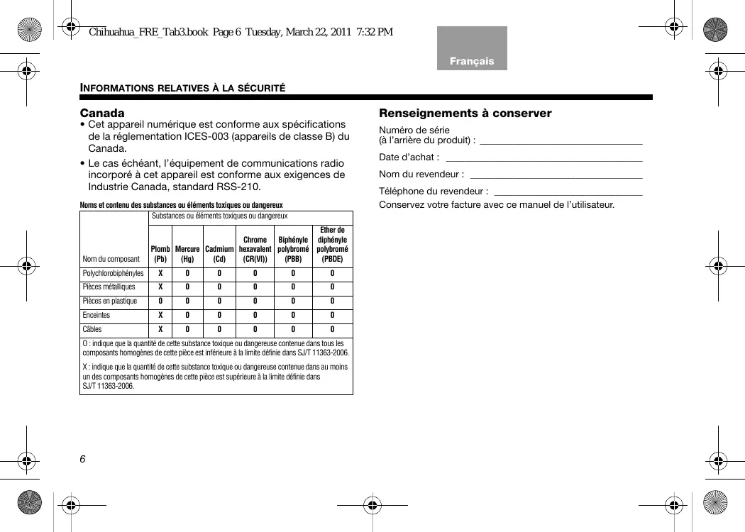 | Nom du composant | Substances ou éléments toxiques ou dangereux | |||||