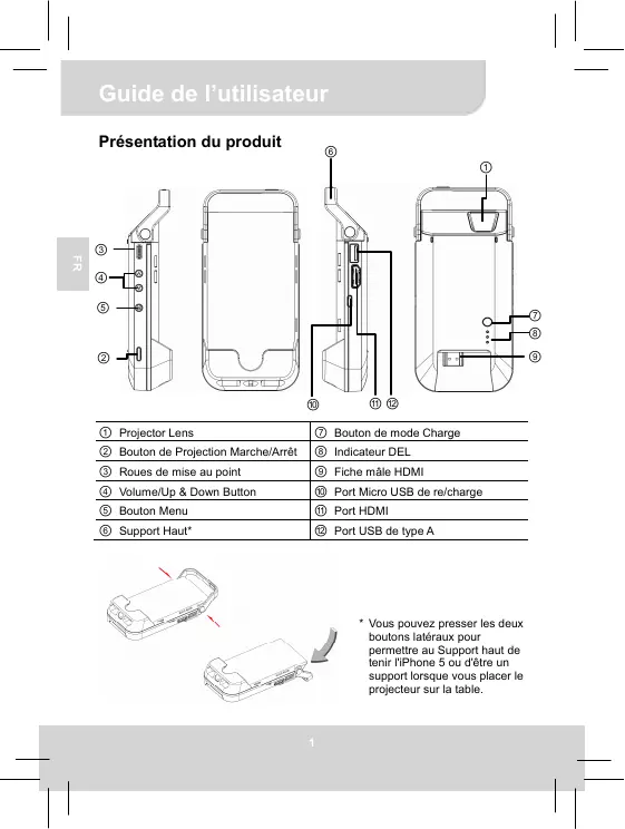 * Vous pouvez presser les deux boutons latéraux pour permettre au Support haut de tenir l'iPhone 5 ou d'être un support lorsque vous placer le projecteur sur la table.