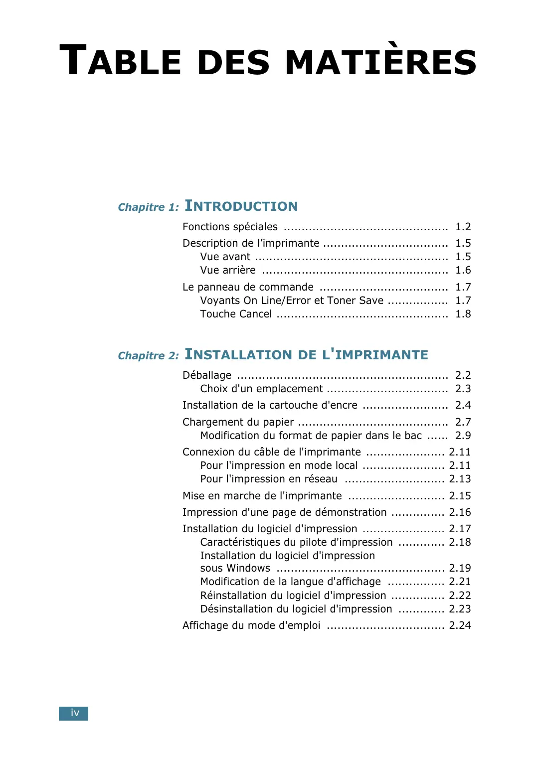 INSTALLATION DE L'IMPRIMANTE Déballage ........................................................... 2.2 Choix d'un emplacement .................................. 2.3 Installation de la cartouche d'encre ........................ 2.4 Chargement du papier .......................................... 2.7 Modification du format de papier dans le bac ...... 2.9 Connexion du câble de l'imprimante ...................... 2.11 Pour l'impression en mode local ....................... 2.11 Pour l'impression en réseau ............................ 2.13 Mise en marche de l'imprimante ........................... 2.15 Impression d'une page de démonstration ............... 2.16 Installation du logiciel d'impression ....................... Caractéristiques du pilote d'impression ............. Installation du logiciel d'impression sous Windows ............................................... Modification de la langue d'affichage ................ Réinstallation du logiciel d'impression ............... Désinstallation du logiciel d'impression .............