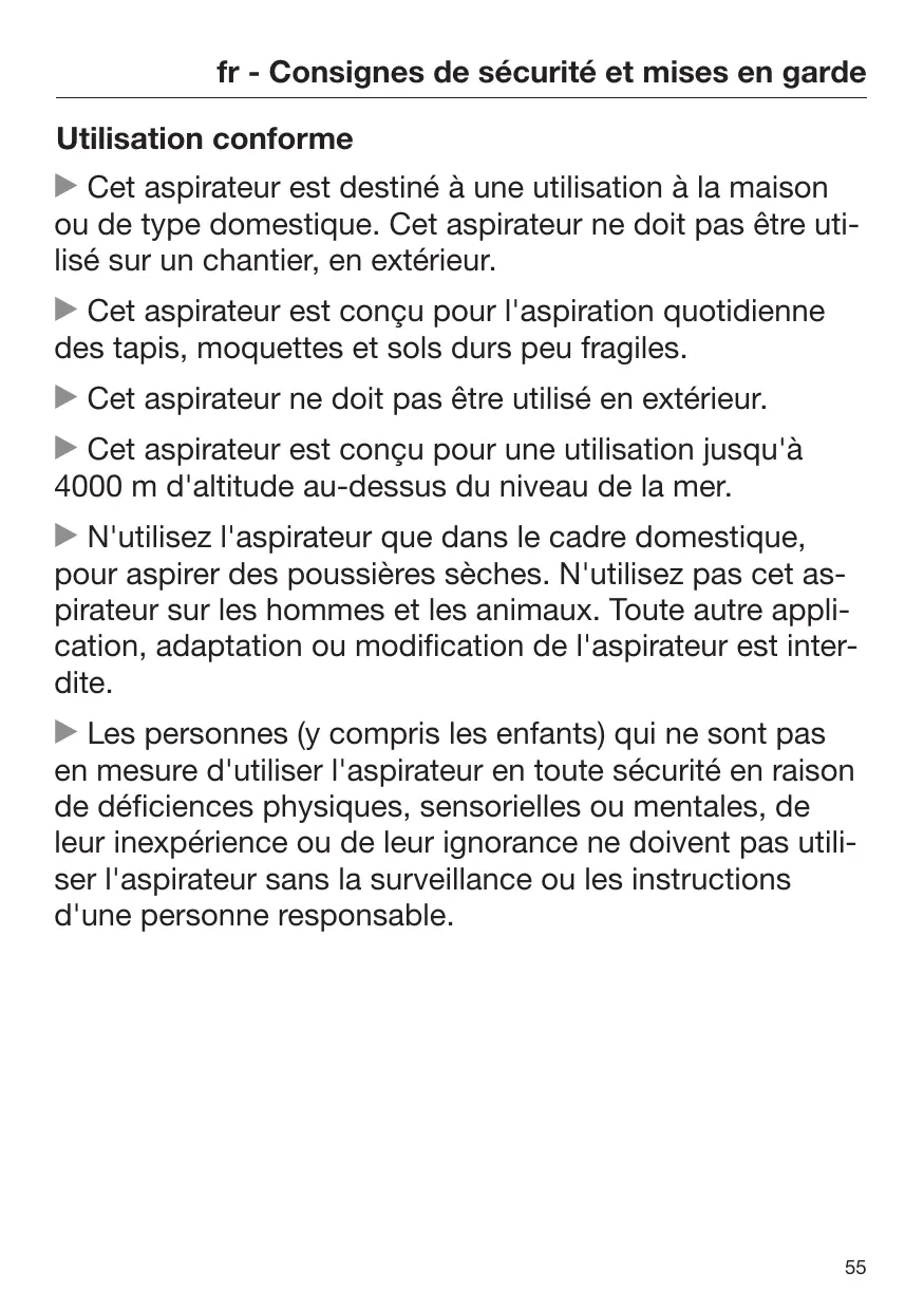 Cet aspirateur ne doit pas être utilisé en extérieur. Cet aspirateur est conçu pour une utilisation jusqu'à 4000 m d'altitude au-dessus du niveau de la mer. N'utilisez l'aspirateur que dans le cadre domestique, pour aspirer des poussières sèches. N'utilisez pas cet aspirateur sur les hommes et les animaux. Toute autre application, adaptation ou modification de l'aspirateur est interdite. Les personnes (y compris les enfants) qui ne sont pas en mesure d'utiliser l'aspirateur en toute sécurité en raison de déficiences physiques, sensorielles ou mentales, de leur inexpérience ou de leur ignorance ne doivent pas utiliser l'aspirateur sans la surveillance ou les instructions d'une personne responsable.