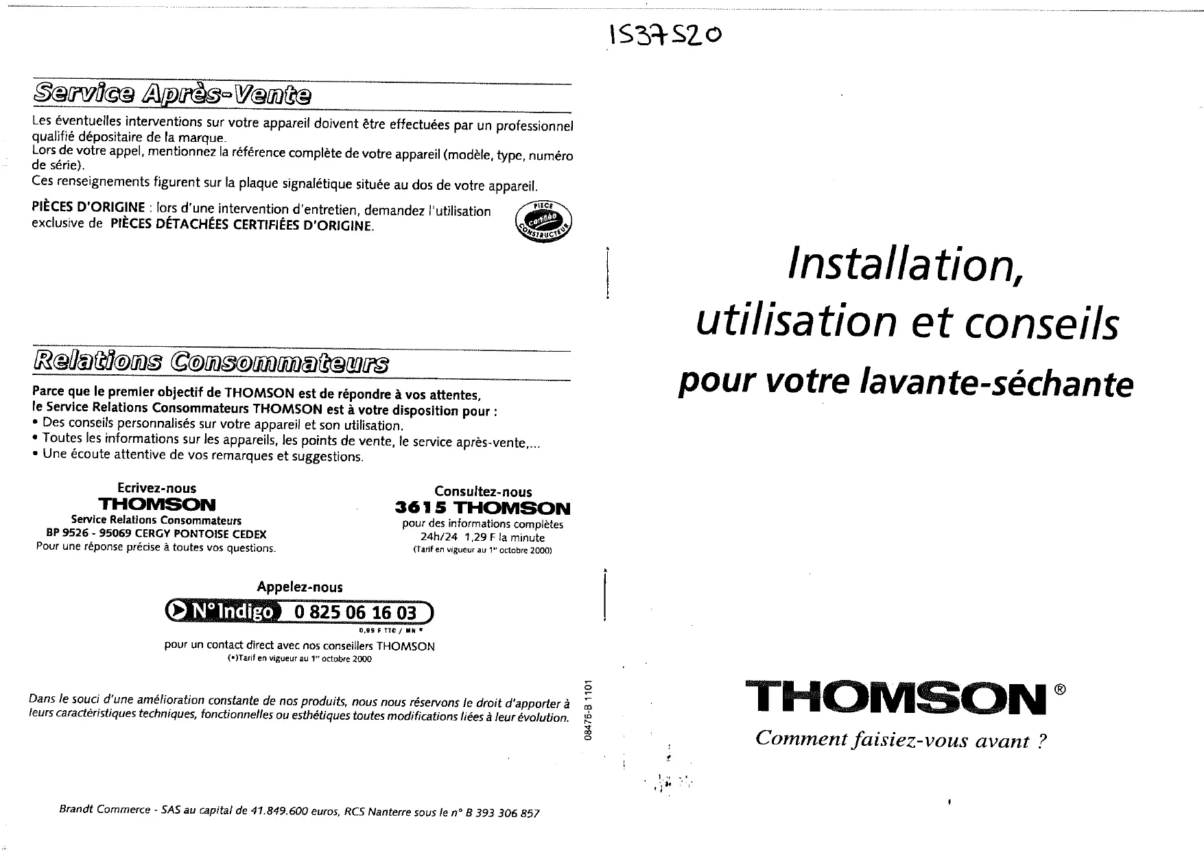 Comme tous les appareils Thomson AUSTRALE, bénéficiez de l'exigence de qualité qui a fait la réputation de notre Marque : une maîtrise technologique de nos produits allant toujours plus loin pour accroître leurs performances et ainsi vous simplifier la vie. Aussi, pour découvrir tous les atouts de votre lavante-seche, nous vous invitons à suivre les conseils d'installation et d'utilisation que vous trouverez à l'intérieur de cette notice.