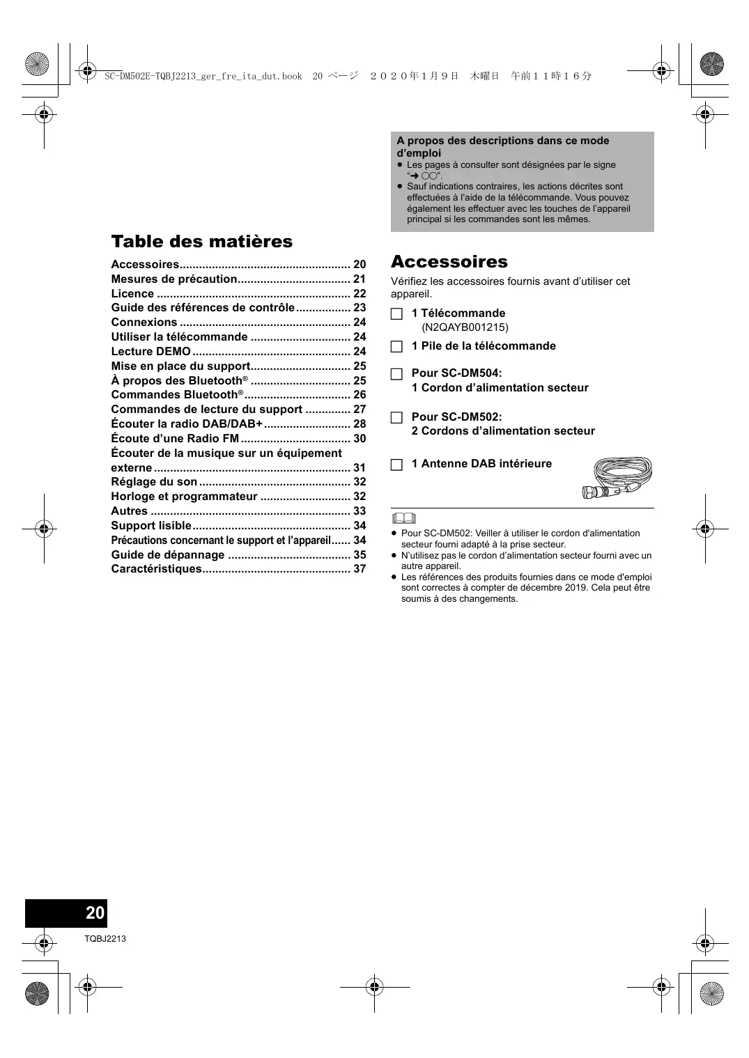 Accessoires 20 Mesures de précaution 21 Licence 22 Guide des références de contrôle 23 Connexions 24 Utiliser la télécommande 24 Lecture DEMO 24 Mise en place du support 25 À propos des Bluetooth® 25 Commandes Bluetooth® 26 Commandes de lecture du support 27 Écouter la radio DAB/DAB+ 28 Écoute d’une Radio FM 30 Écouter de la musique sur un équipement externe 31 Réglage du son 32 Horloge et programmateur 32 Autres 33 Support lisible 34 Précautions concernant le support et l’appareil 34 Guide de dépannage 35 Caractéristiques 37