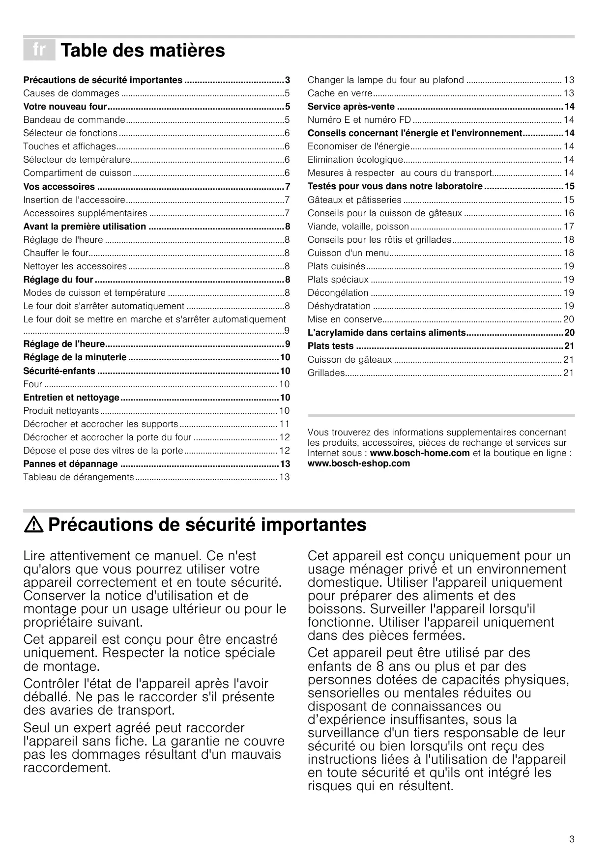 - Grillades Produktinfo Vous trouverez des informations supplementaires concernant les produits, accessoires, pièces de rechange et services sur Internet sous : www.bosch-home.com et la boutique en ligne : www.bosch-eshop.com : Précautions de sécurité importantes Lire attentivement ce manuel. Ce n'est qu'alors que vous pourrez utiliser votre appareil correctement et en toute sécurité. Conserver la notice d'utilisation et de montage pour un usage ultérieur ou pour le propriétaire suivant. Cet appareil est conçu pour être encastré uniquement. Respecter la notice spéciale de montage. Contrôler l'état de l'appareil après l'avoir déballé. Ne pas le raccorder s'il présente des avaries de transport. Seul un expert agréé peut raccorder l'appareil sans fiche. La garantie ne couvre pas les dommages résultant d'un mauvais raccordement. Cet appareil est conçu uniquement pour un usage ménager privé et un environnement domestique. Utiliser l'appareil uniquement pour préparer des aliments et des boissons. Surveiller l'appareil lorsqu'il fonctionne. Utiliser l'appareil uniquement dans des pièces fermées. Cet appareil peut être utilisé par des enfants de 8 ans ou plus et par des personnes dotées de capacités physiques, sensorielles ou mentales réduites ou disposant de connaissances ou d’expérience insuffisantes, sous la surveillance d'un tiers responsable de leur sécurité ou bien lorsqu'ils ont reçu des instructions liées à l'utilisation de l'appareil en toute sécurité et qu'ils ont intégré les risques qui en résultent. p. 21