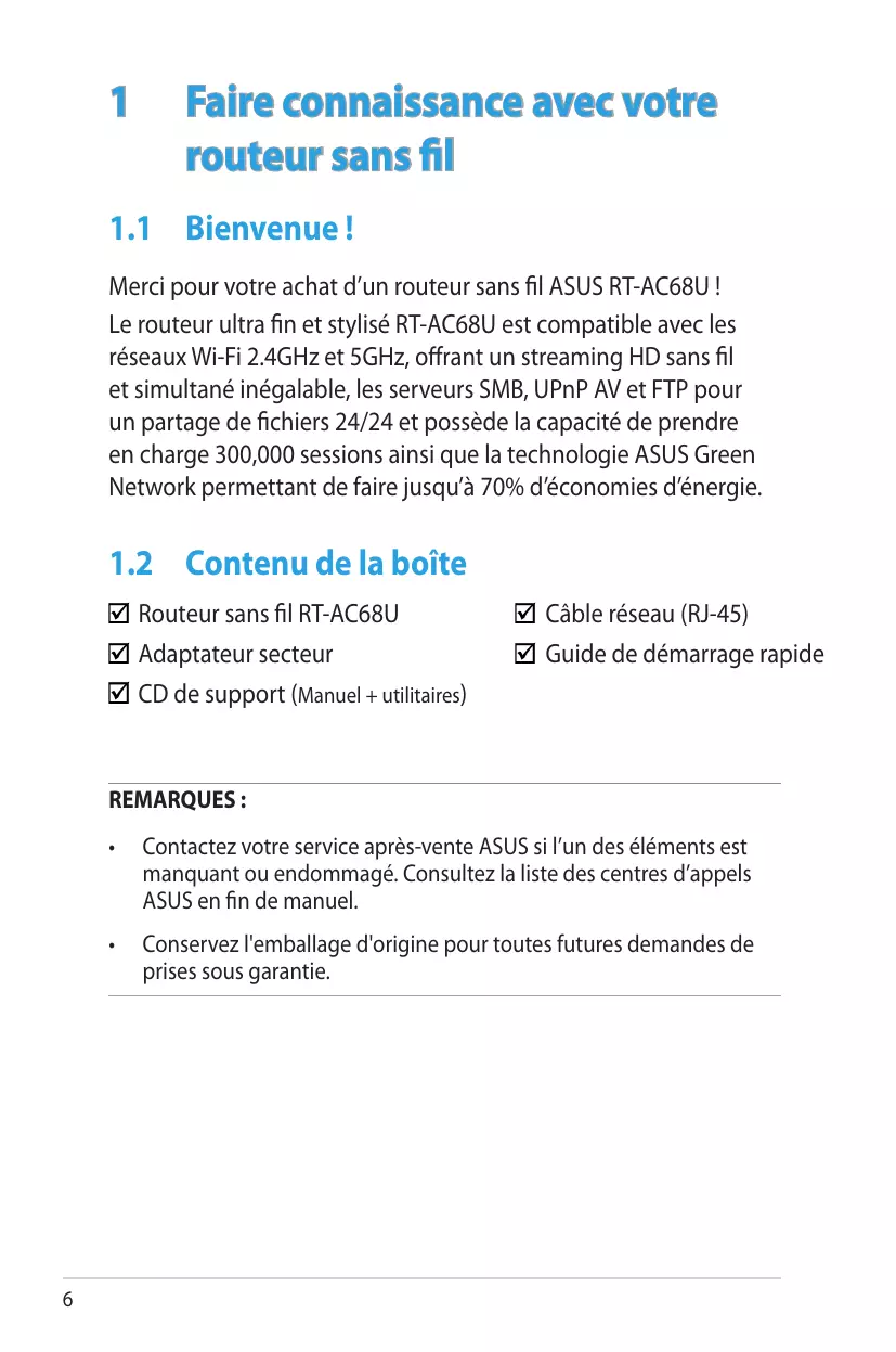 Routeur sans fil RT-AC68U Adaptateur secteur CD de support (Manuel + utilitaires) Câble réseau (RJ-45) Guide de démarrage rapide REMARQUES :