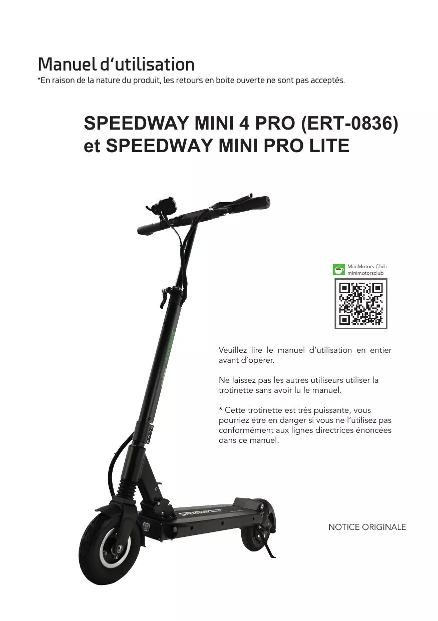 - Les trottinettes Mini Motors sont classées comme « véhicules sportifs extrêmes ». En raison de la nature du produit, des vérifications d'entretien occasionnelles sont requises.