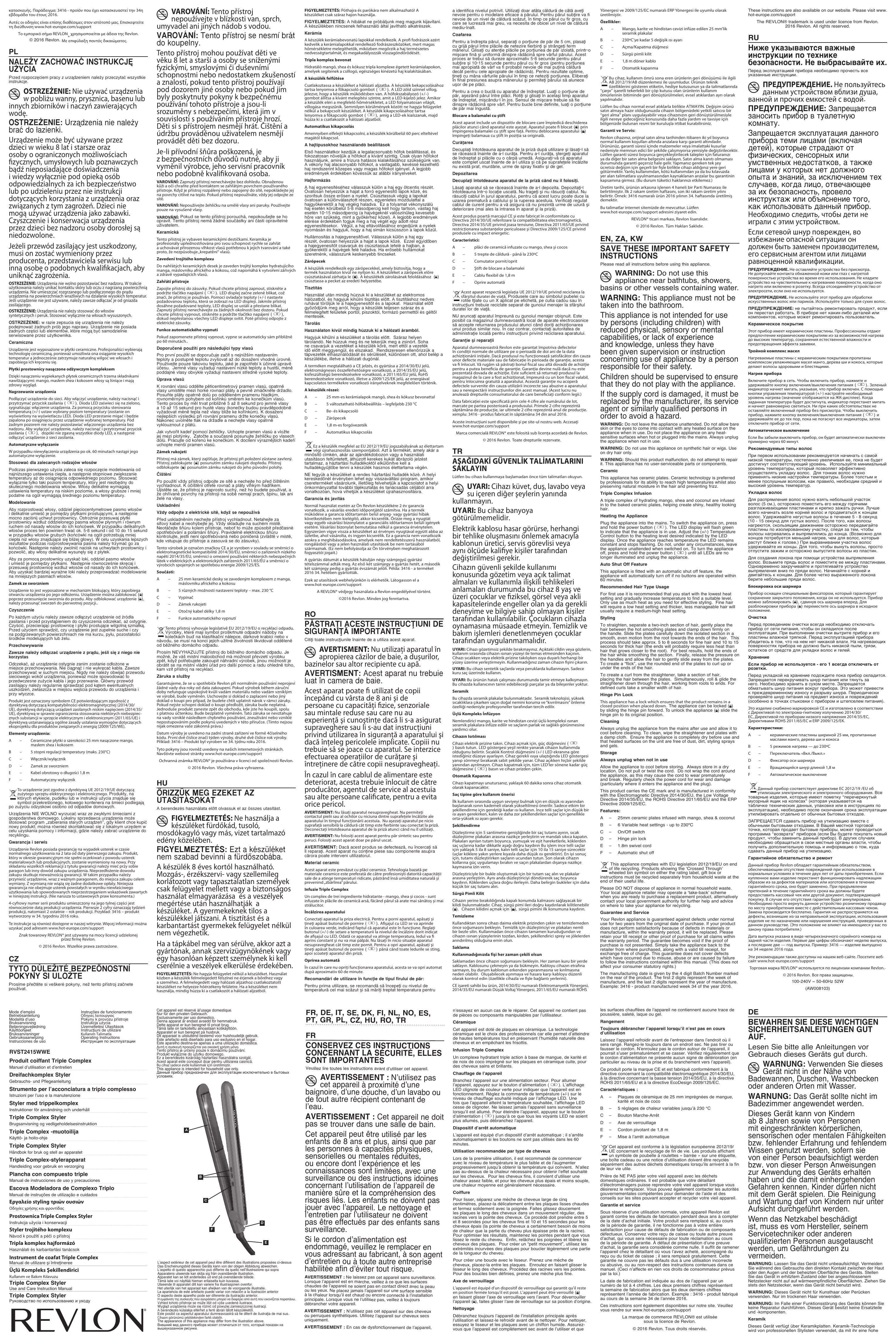 Mise à l’arrêt automatique Cet appareil est conforme à la législation européenne 2012/19/ UE concernant le recyclage de fin de vie. Les produits affichant un symbole de poubelle à roulettes « barrée » sur une étiquette, une boîte cadeau ou une notice d’utilisation doivent être recyclés séparément des autres déchets domestiques lorsqu’ils arrivent à la fin de leur vie utile. Prière de NE PAS jeter votre vieil appareil avec les déchets domestiques ordinaires. Il est probable que votre détaillant d’électroménagers puisse reprendre votre vieil appareil lorsque vous désirerez le remplacer. Vous pouvez également contacter les autorités gouvernementales compétentes pour demander de l’aide et des conseils sur les sites pouvant accepter et recycler votre vieil appareil. Garantie et service Sous réserve d’une utilisation normale, votre appareil Revlon est garanti contre les défauts de fabrication pendant deux ans à compter de la date d’achat initiale. Votre produit sera remplacé si, au cours de la période de garantie, il ne fonctionne pas à votre entière satisfaction pour cause de défauts de fabrication ou de composants défectueux. Conservez votre reçu de caisse ou toute autre preuve d’achat, qui vous sera nécessaire pour toute réclamation au cours de la période de garantie. À défaut de présentation d’une preuve d’achat, la garantie sera considérée comme nulle. Il suffit de ramener l’appareil chez le détaillant où vous l’avez acheté, accompagné du reçu ou du ticket de caisse ; il sera remplacé gratuitement. Cette garantie ne couvre pas les défauts dus à une utilisation incorrecte ou abusive, ou au non-respect des instructions contenues dans ce manuel. (Ceci n’affecte en rien vos droits de consommateur prévus par la loi.) La date de fabrication est indiquée au dos de l’appareil par un numéro de lot à 4 chiffres. Les deux premiers chiffres représentent la semaine de fabrication alors que les deux derniers chiffres représentent l’année de fabrication. Exemple : 3416 - produit fabriqué au cours de la semaine 34 de l’année 2016. Ces instructions sont également disponibles sur notre site. Veuillez vous rendre sur www.hot-europe.com/support La marque de commerce REVLON® est utilisée sous la licence de Revlon. © 2016 Revlon. Tous droits réservés. Перед проведением очистки всегда необходимо отключать прибор от сети питания, чтобы он охладился после эксплуатации. При выполнении очистки вытрите прибор и его пластины влажной тряпкой. Перед эксплуатацией прибора убедитесь в том, что на нем нет никакой влаги. На нагревающих поверхностях прибора не должно быть никакой пыли, грязи, остатков от средств для укладки волос и гелей. Если прибор не используется - его 1 всегда отключать от Перед укладкой на хранение подождите пока прибор охладится. Запрещается перекручивать шнур питания или тянуть за него. Необходимо хранить в сухом месте. Запрещается обматывать шнур питания вокруг прибора. Это может привести к преждевременному износу и разрыву шнура. Периодически проверяйте шнур питания на предмет износа и повреждений (особенно в точках стыковки с прибором и штепселем питания). Это изделие снабжено маркировкой CE и изготовлено в соответствии с Директивой по электрома-гнитному излучению 2014/30/ ЕС, Директивой по приборам низкого напряжения 2014/35/ЕС, Директивами ROHS 2011/65/ЕС и ERP 2009/125/ЕК. Характеристики: