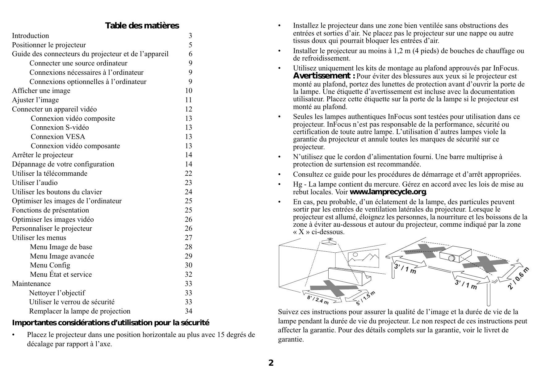 - Installer le projecteur au moins à 1,2m (4 pieds) de bouches de chauffage ou de refroidissement. Utilisez uniquement les kits de montage au plafond approuvés par InFocus. Avertissement : Pour éviter des blessures aux yeux si le projecteur est monté au plafond, portez des lunettes de protection avant d'ouvrir la porte de la lampe. Une étiquette d'avertissement est incluse avec la documentation utilisateur. Placez cette étiquette sur la porte de la lampe si le projecteur est monté au plafond.