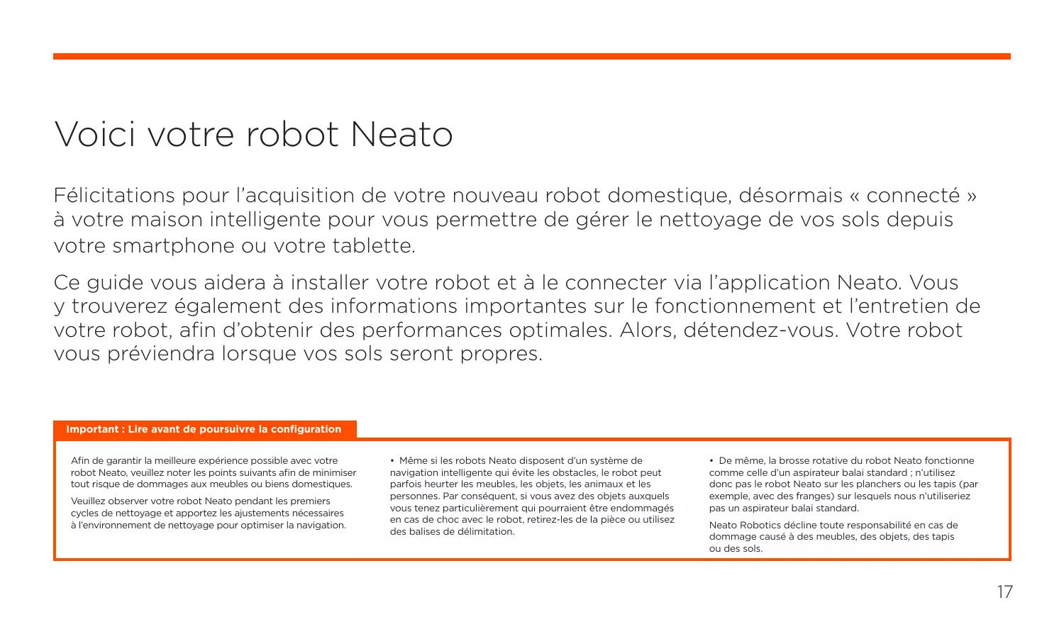 Important : Lire avant de poursuivre la configuration Afin de garantir la meilleure expérience possible avec votre robot Neato, veuillez noter les points suivants afin de minimiser tout risque de dommages aux meubles ou biens domestiques. Veuillez observer votre robot Neato pendant les premiers cycles de nettoyage et apportez les ajustements nécessaires à l’environnement de nettoyage pour optimiser la navigation.