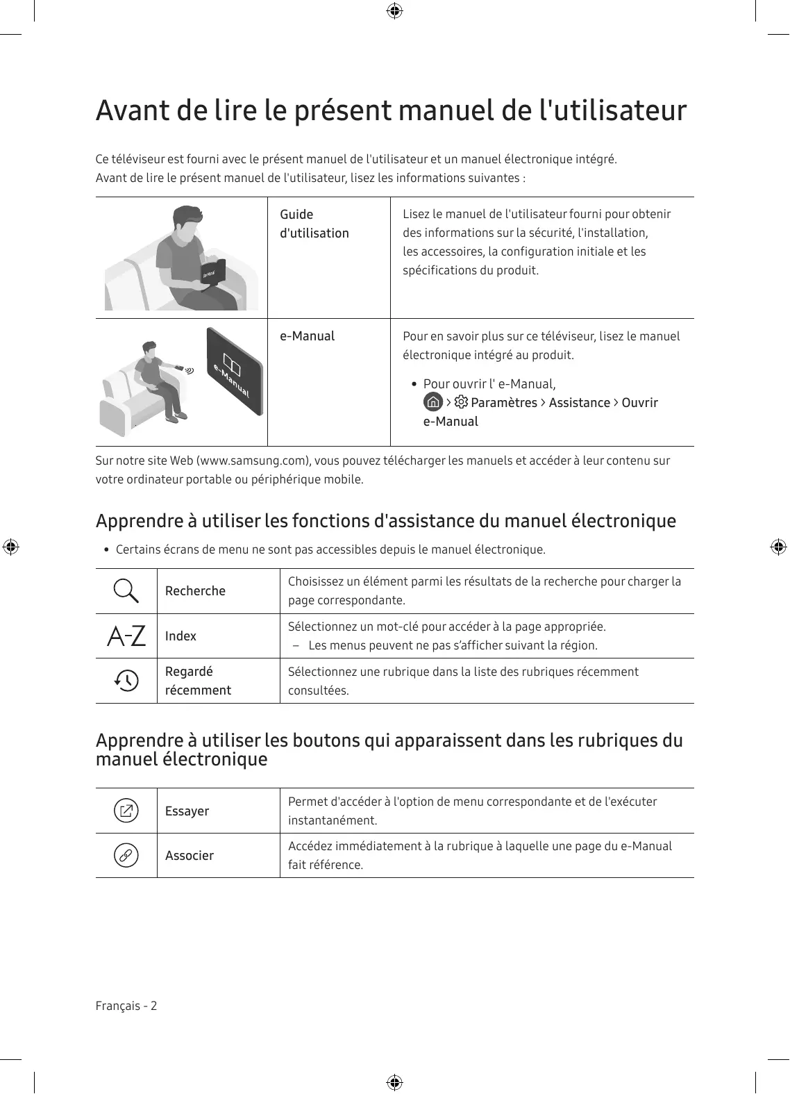 | e-Manual | Pour en savoir plus sur ce télévisuer, lisez le manuel électronique intégré au produit. • Pour ouvrir l' e-Manual, > Paramètres > Assistance > Ouvrir e-Manual |