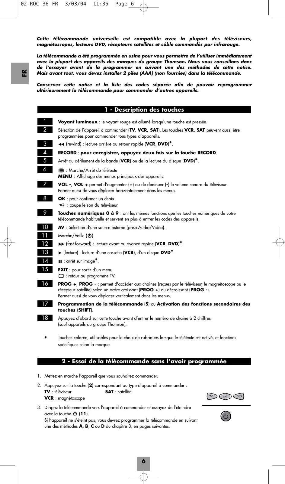 Voyant lumineux : le voyant rouge est allumé lorsqu’une touche est pressée. Sélection de l’appareil à commander (TV, VCR, SAT). Les touches VCR, SAT peuvent aussi être programmées pour commander tous types d’appareils.