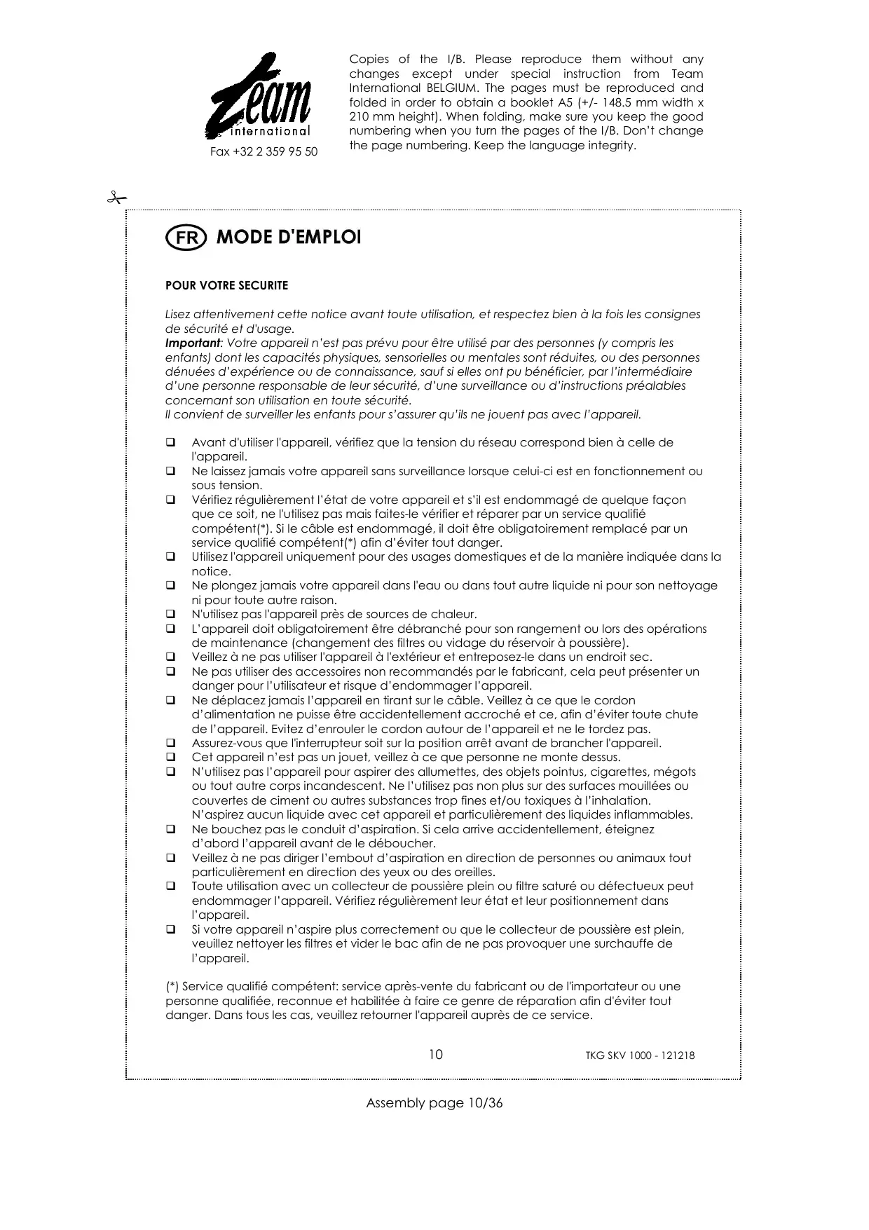 Copies of the I/B. Please reproduce them without any changes except under special instruction from Team International BELGIUM. The pages must be reproduced and folded in order to obtain a booklet A5 (+/- 148.5 mm width x 210 mm height). When folding, make sure you keep the good numbering when you turn the pages of the I/B. Don’t change the page numbering. Keep the language integrity.