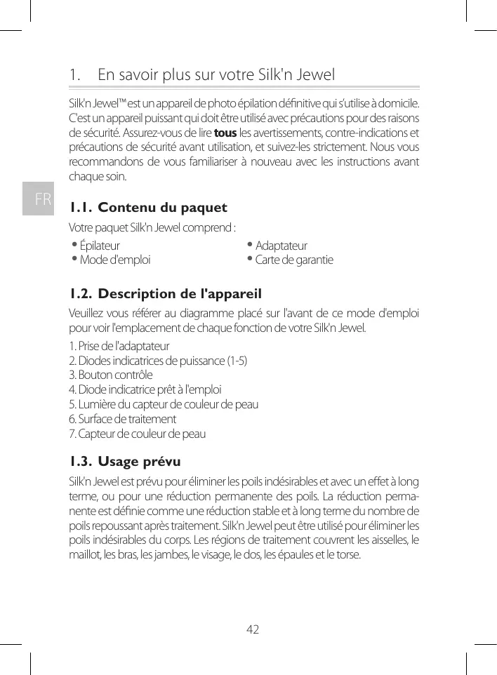 Silk'n Jewel™ est un appareil de photofération définitive qui s'utilise à domicile. C'est un appareil puissant qui doit être utilisé avec précautions pour des raisons de sécurité. Assurez-vous de lire tous les avertissements, contre-indications et précautions de sécurité avant utilisation, et suivez-les strictement. Nous vous recommandons de vous familiariser à nouveau avec les instructions avant chaque soin.