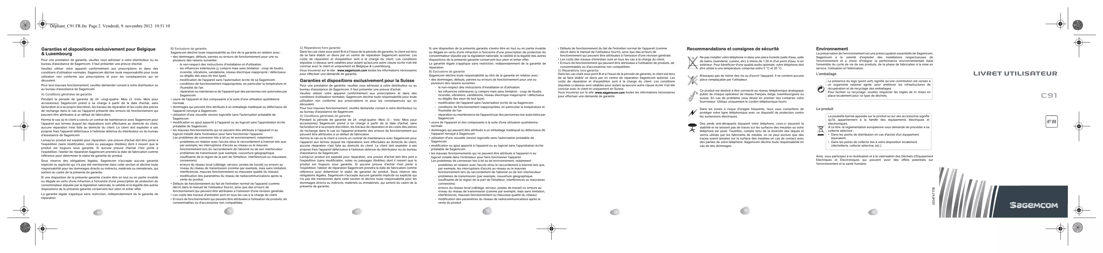 Dépliant_C91 FR.fm Page 2 Vendredi, 9. novembre 2012 10:51 10 Pour une prestation de garantie, veuillez vous adresser à votre distributeur ou au bureau d'assistance de Sagemcom. Il faut présenter une preuve d'achat. Veuillez utiliser votre appareil conformément aux prescriptions et dans des conditions d'utilisation normales. Sagemcom décline toute responsabilité pour toute utilisation non conforme aux prescriptions et pour les conséquences qui en découlent. Pour tout mauvais fonctionnement, veuillez demander conseil à votre distributeur ou au bureau d'assistance de Sagemcom. A) Conditions générales de garantie Pendant la période de garantie de 24 -vingt-quatre- Mois (3 -trois- Mois pour accessoires) Sagemcom prend à sa charge à partir de la date d'achat, sans facturation et à sa propre discrétion, les travaux de réparation et les coûts des pièces de rechange dans le cas où l'appareil présente des erreurs de fonctionnement qui peuvent être attribuées à un défaut de fabrication. Hormis le cas où le client a conclu un contrat de maintenance avec Sagemcom pour l'appareil aux termes duquel les réparations sont effectuées au domicile du client, aucune réparation n'est faite au domicile du client. Le client doit expédier à ses propres frais l'appareil défectueux à l'adresse obtenue du distributeur ou du bureau d'assistance de Sagemcom. Lorsqu'un produit est expédié pour réparation, une preuve d'achat doit être jointe à l'expédition (sans modification, notes ou passages illisibles) dont il ressort que le produit est toujours sous garantie. Si aucune preuve d'achat n'est jointe à l'expédition, l'atelier de réparation Sagemcom prendra la date de fabrication comme référence pour déterminer le statut de garantie du produit. Sous réserve des obligations légales, Sagemcom n'accepte aucune garantie implicite ou explicite qui n'a pas été mentionnée dans cette section et décline toute responsabilité pour les dommages directs ou indirects, matériels ou immatériels, qui sortent du cadre de la présente de garantie. Si une disposition de la présente garantie s'avère être en tout ou en partie invalide ou illégale en vertu d'une infraction à l'encontre d'une prescription de protection du consommateur stipulée par la législation nationale, la validité et la légalité des autres dispositions de la présente garantie conservent leur plein et entier effet. La garantie légale s'applique sans restriction, indépendamment de la garantie de réparation.