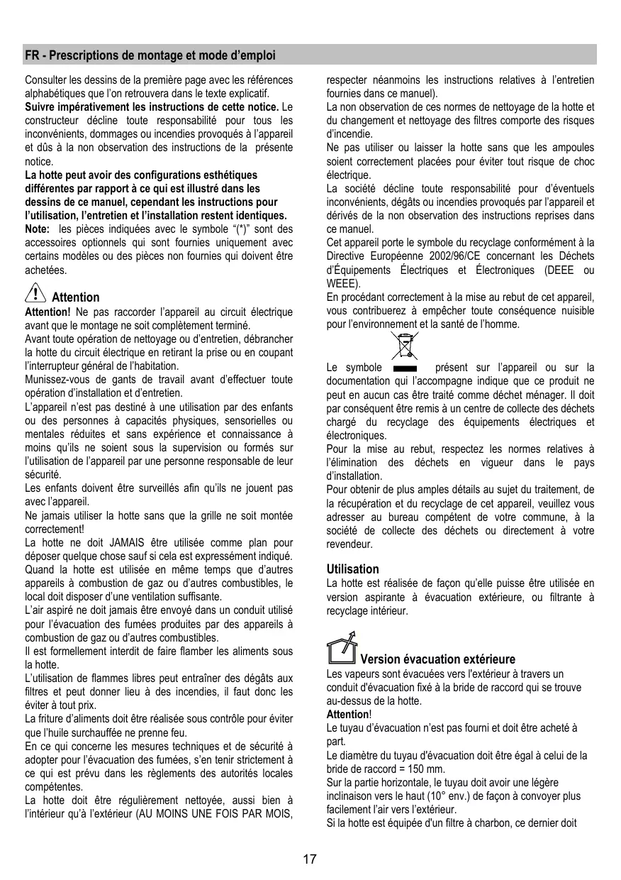 La hotte est réalisée de façon qu'elle puisse être utilisée en version aspirante à évacuation extérieure, ou filtrante à recyclage intérieur.