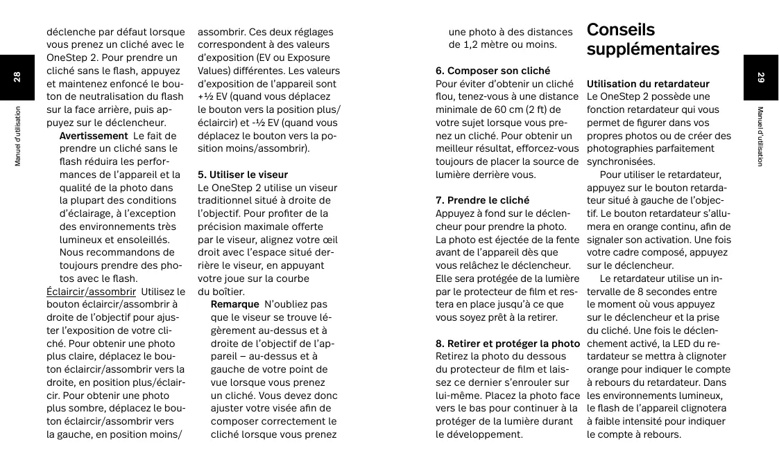 Retirez la photo du dessous du protecteur de film et laissez ce dernier s’enrouler sur lui-même. Placez la photo face vers le bas pour continuer à la protéger de la lumière durant le développement. Conseils supplémentaires Utilisation du retardateur Le OneStep 2 possède une fonction retardateur qui vous permet de figurer dans vos propres photos ou de créer des photographies parfaitement synchronisées. Pour utiliser le retardateur, appuyez sur le bouton retardateur situé à gauche de l’objectif. Le bouton retardateur s’allumera en orange continu, afin de signaler son activation. Une fois votre cadre composé, appuyez sur le déclencheur. Le retardateur utilise un intervalle de 8 secondes entre le moment où vous appuyez sur le déclencheur et la prise du cliché. Une fois le déclenchement activé, la LED du retardateur se mettra à clignoter orange pour indiquer le compte à rebours du retardateur. Dans les environnements lumineux, le flash de l’appareil clignotera à faible intensité pour indiquer le compte à rebours. Manuel d’utilisation assombrir. Ces deux réglages correspondent à des valeurs d’exposition (EV ou Exposure Values) différentes. Les valeurs d’exposition de l’appareil sont +½ EV (quand vous déplacez le bouton vers la position plus/ éclaircir) et -½ EV (quand vous déplacez le bouton vers la position moins/assombrir).
