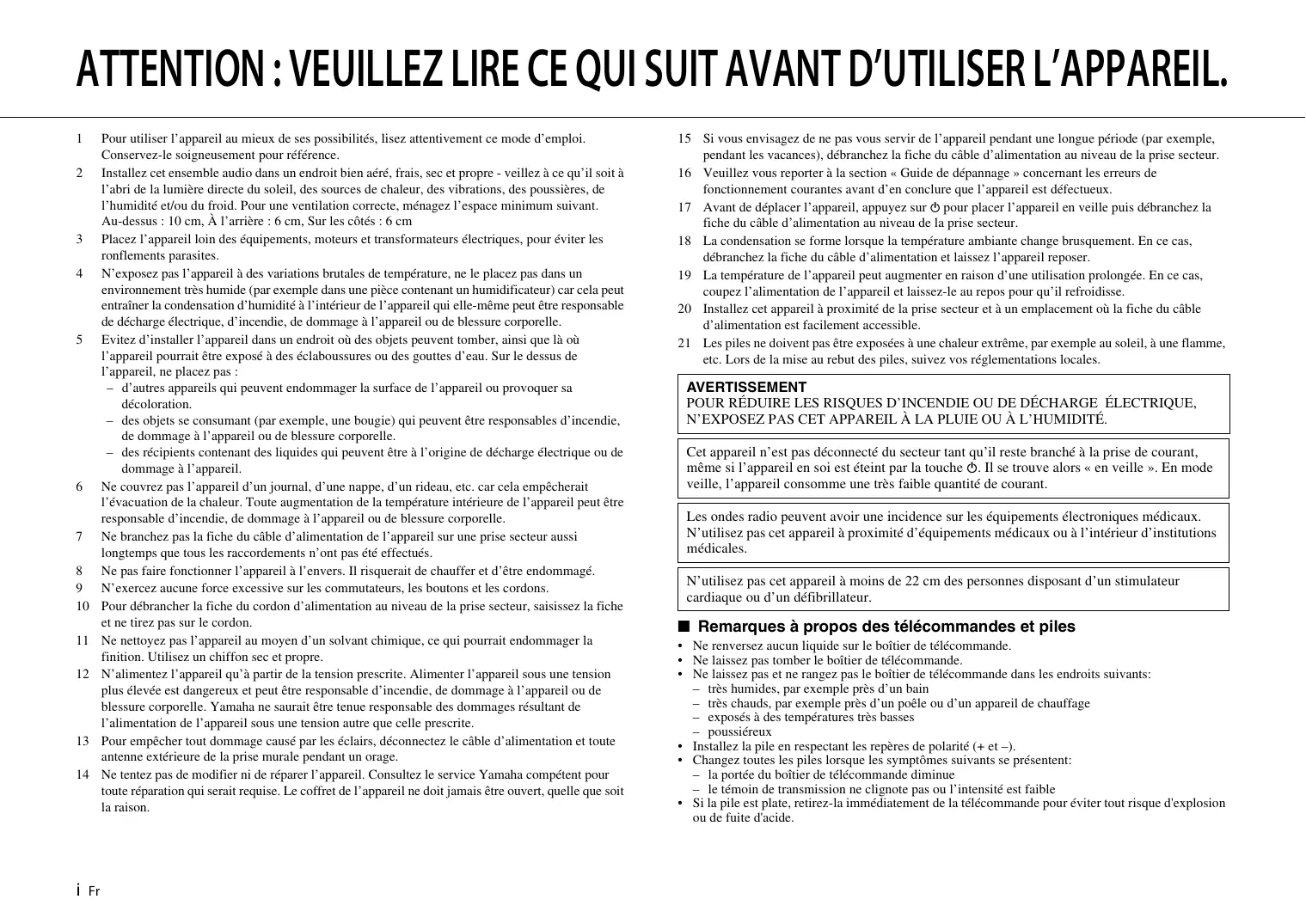 Au-dessus : 10 cm, À l’arrière : 6 cm, Sur les côtés : 6 cm Placez l’appareil loin des équipements, moteurs et transformateurs électriques, pour éviter les ronflements parasites. N’exposez pas l’appareil à des variations brutales de température, ne le placez pas dans un environnement très humide (par exemple dans une pièce contenant un humidificateur) car cela peut entraîner la condensation d’humidité à l’intérieur de l’appareil qui elle-même peut être responsable de décharge électrique, d’incendie, de dommage à l’appareil ou de blessure corporelle. Evitez d’installer l’appareil dans un endroit où des objets peuvent tomber, ainsi que là où l’appareil pourrait être exposé à des éclaboussures ou des gouttes d’eau. Sur le dessus de l’appareil, ne placez pas : – d’autres appareils qui peuvent endommager la surface de l’appareil ou provoquer sa décoloration. – des objets se consumant (par exemple, une bougie) qui peuvent être responsables d’incendie, de dommage à l’appareil ou de blessure corporelle. – des récipients contenant des liquides qui peuvent être à l’origine de décharge électrique ou de dommage à l’appareil. Ne couvrez pas l’appareil d’un journal, d’une nappe, d’un rideau, etc. car cela empêcherait l’évacuation de la chaleur. Toute augmentation de la température intérieure de l’appareil peut être responsable d’incendie, de dommage à l’appareil ou de blessure corporelle. Ne branchez pas la fiche du câble d’alimentation de l’appareil sur une prise secteur aussi longtemps que tous les raccordements n’ont pas été effectués. Ne pas faire fonctionner l’appareil à l’envers. Il risquerait de chauffer et d’être endommagé. N’exercez aucune force excessive sur les commutateurs, les boutons et les cordons. Pour débrancher la fiche du cordon d’alimentation au niveau de la prise secteur, saisissez la fiche et ne tirez pas sur le cordon. Ne nettoyez pas l’appareil au moyen d’un solvant chimique, ce qui pourrait endommager la finition. Utilisez un chiffon sec et propre. N’alimentez l’appareil qu’à partir de la tension prescrite. Alimenter l’appareil sous une tension plus élevée est dangereux et peut être responsable d’incendie, de dommage à l’appareil ou de blessure corporelle. Yamaha ne saurait être tenue responsable des dommages résultant de l’alimentation de l’appareil sous une tension autre que celle prescrite. Pour empêcher tout dommage causé par les éclairs, déconnectez le câble d’alimentation et toute antenne extérieure de la prise murale pendant un orage. Ne tentez pas de modifier ni de réparer l’appareil. Consultez le service Yamaha compétent pour toute réparation qui serait requise. Le coffret de l’appareil ne doit jamais être ouvert, quelle que soit la raison.