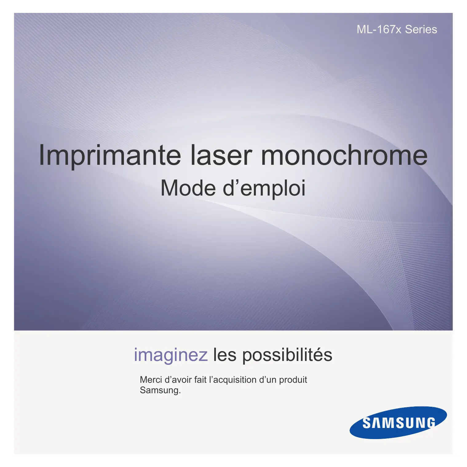 ML-167x Series Imprimante laser monochrome Mode d’emploi imaginez les possibilités Merci d’avoir fait l’acquisition d’un produit Samsung. Copyright © 2010 Samsung Electronics Co., Ltd. Tous droits réservés. Le présent mode d’emploi n’est fourni qu’à titre informatif. Toutes les informations communiquées ci-après sont susceptibles d’être modifiées sans préavis. Samsung Electronics ne saurait être tenu pour responsable des dommages, directs ou indirects, consécutifs à l’utilisation de ce mode d’emploi.