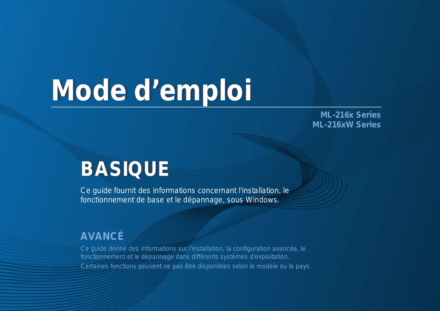 Mode d’emploi ML-216x Series ML-216xW Series BASIQUE BASIQUE Ce guide fournit des informations concernant l'installation, le fonctionnement de base et le dépannage, sous Windows. AVANCÉ Ce guide donne des informations sur l'installation, la configuration avancée, le fonctionnement et le dépannage dans différents systèmes d'exploitation. Certaines fonctions peuvent ne pas être disponibles selon le modèle ou le pays. BASIQUE