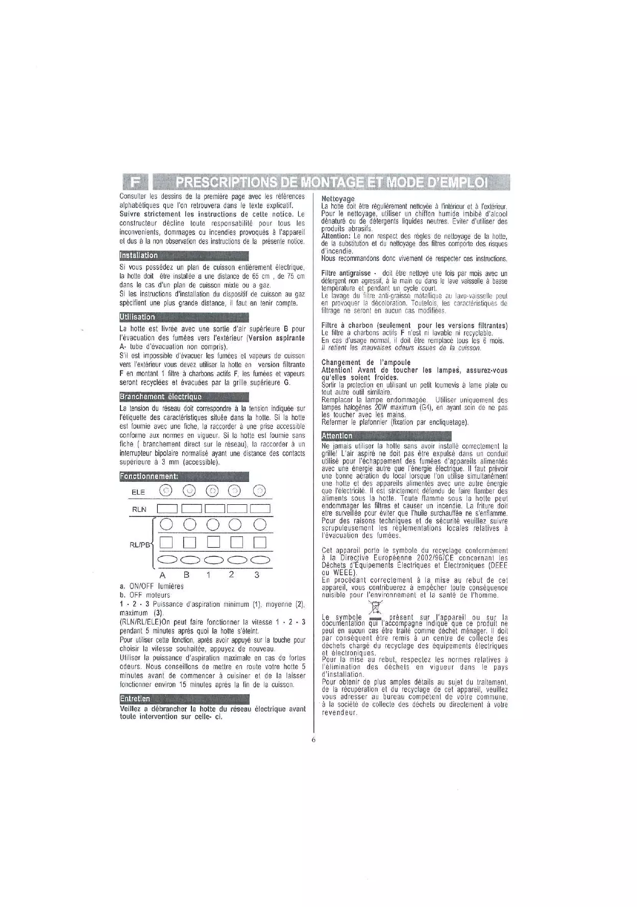 S'il est impossible d'évacuer les fumées et vapeurs de cuisson vers l'extérieur, vous devez utiliser la hotte en version filtrante F en montant 1 filtre à charbons actifs F, les fumées et vapeurs seront recyclées et évacuées par la grille supérieure G.