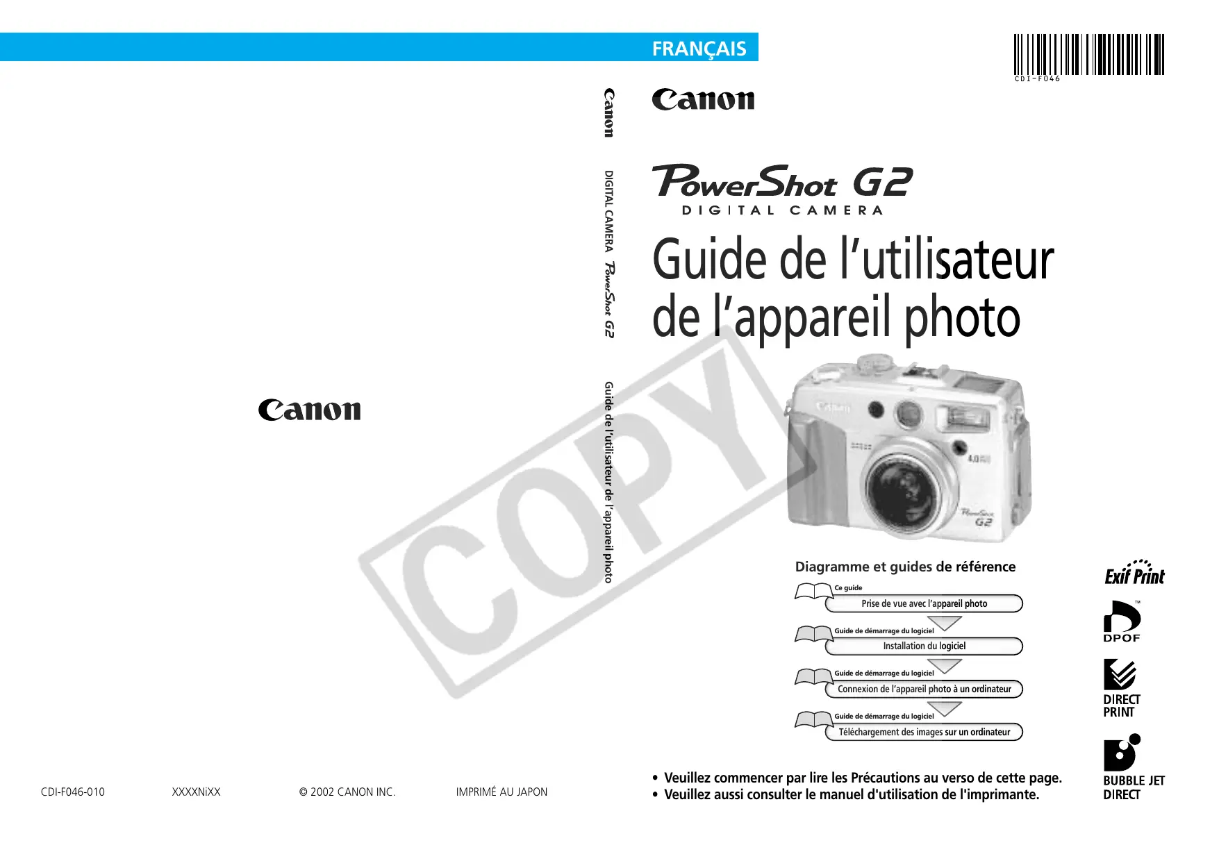 FRANÇAIS CDI-F046 DIGITAL CAMERA Guide de l’utilisateur de l’appareil photo Guide de l’utilisateur de l’appareil photo Diagramme et guides de référence Ce guide Prise de vue avec l’appareil photo Guide de démarrage du logiciel Installation du logiciel Guide de démarrage du logiciel Connexion de l’appareil photo à un ordinateur Guide de démarrage du logiciel Téléchargement des images sur un ordinateur CDI-F046-010 XXXXNiXX © 2002 CANON INC.