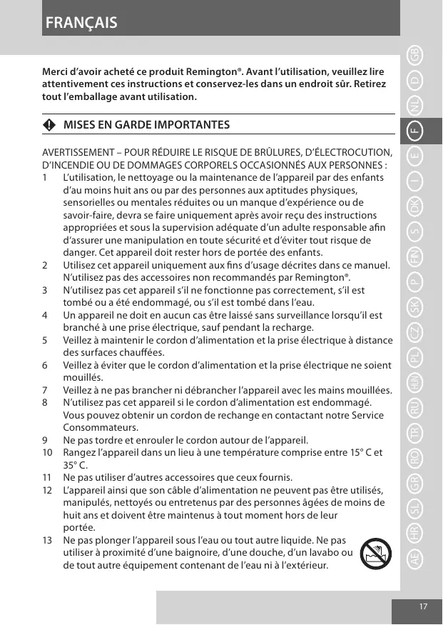 L'utilisation, le nettoyage ou la maintenance de l'appareil par des enfants d'au moins huit ans ou par des personnes aux aptitudes physiques, sensorielles ou mentales réduites ou un manque d'expérience ou de savoir-faire, devra se faire uniquement après avoir reçu des instructions appropriées et sous la supervision ajustée d'un adulte responsable afin d'assurer une manipulation en toute sécurité et d'éviter tout risque de danger. Cet appareil doit rester hors de portée des enfants. 2 Utilisez cet appareil uniquement aux fins d'usage décrites dans ce manuel. N'utilisez pas des accessoires non recommandés par Remington. 3 N'utilisez pas cet appareil s'il ne fonctionne pas correctement, s'il est tombé ou a été endommagé, ou s'il est tombé dans l'eau. 4 Un appareil ne doit en aucun cas être laissé sans surveillance lorsqu'il est branché à une prise électrique, sauf pendant la recharge. 5 Veillez à maintenir le cordon d'alimentation et la prise électrique à distance des surfaces chauffées. 6 Veillez à éviter que le cordon d'alimentation et la prise électrique ne soient mouillés. 7 Veillez à ne pas brancher ni débrancher l'appareil avec les mains mouillées. 8 N'utilisez pas cet appareil si le cordon d'alimentation est endommagé. Vous pouvez obtenir un cordon de rechange en contactant notre Service Consommateurs. 9 Ne pas tordre et enrouler le cordon autour de l'appareil. 10 Rangez l'appareil dans un lieu à une température comprise entre 15°C et 35°C. 11 Ne pas utiliser d'autres accessoires que ceux fournis. 12 L'appareil ainsi que son câble d'alimentation ne peuvent pas être utilisés, manipulés, nettoyés ou entretenus par des personnes âgées de moins de huit ans et doivent être maintenus à tout moment hors de leur portée. 13 Ne pas plonger l'appareil sous l'eau ou tout autre liquide. Ne pas utiliser à proximité d'une baignoire, d'une douche, d'un lavabo ou de tout autre équipement contenant de l'eau ni à l'extérieur.